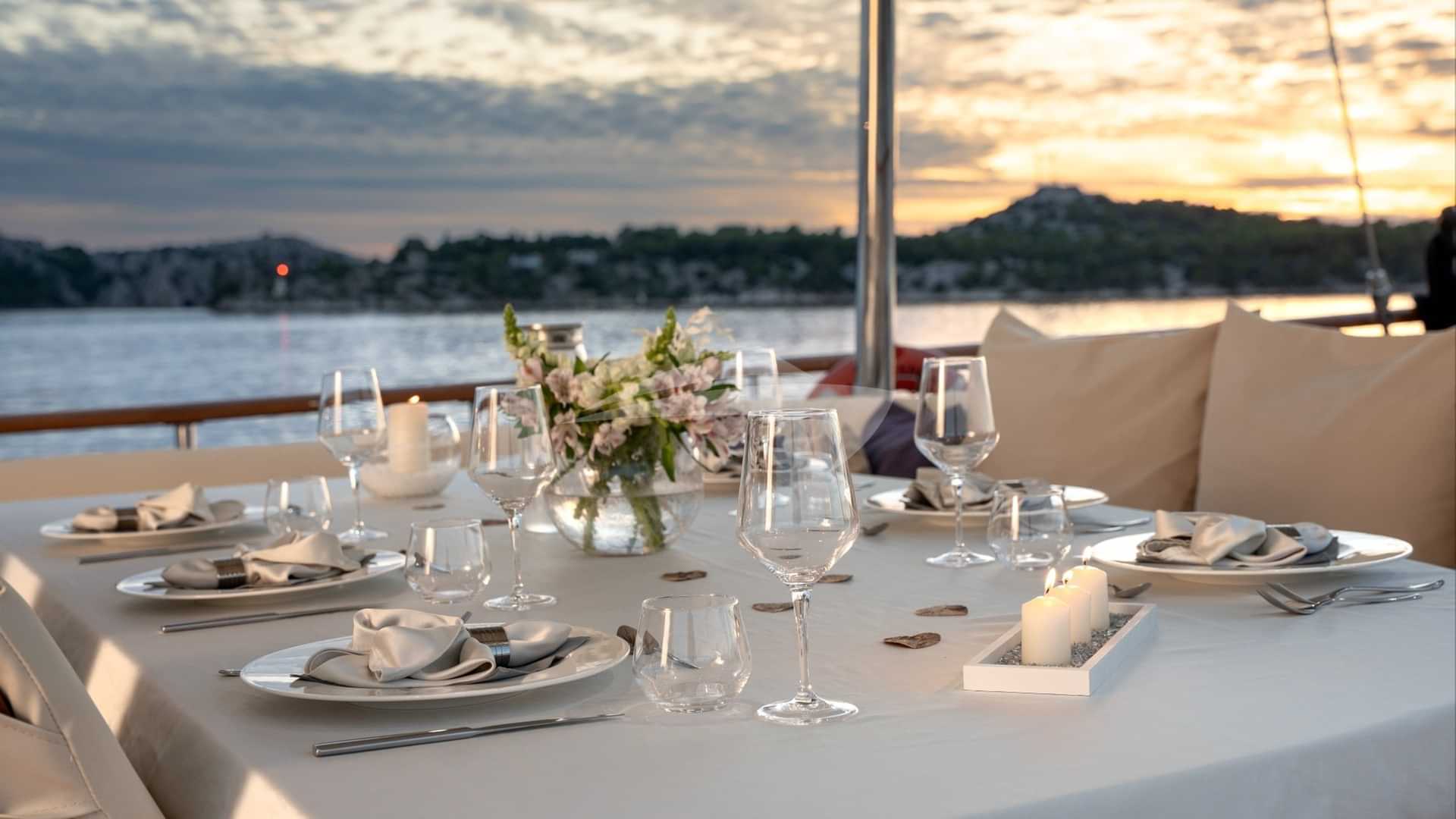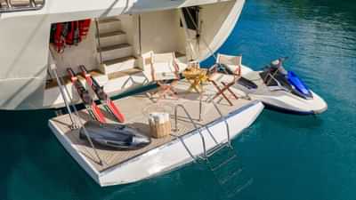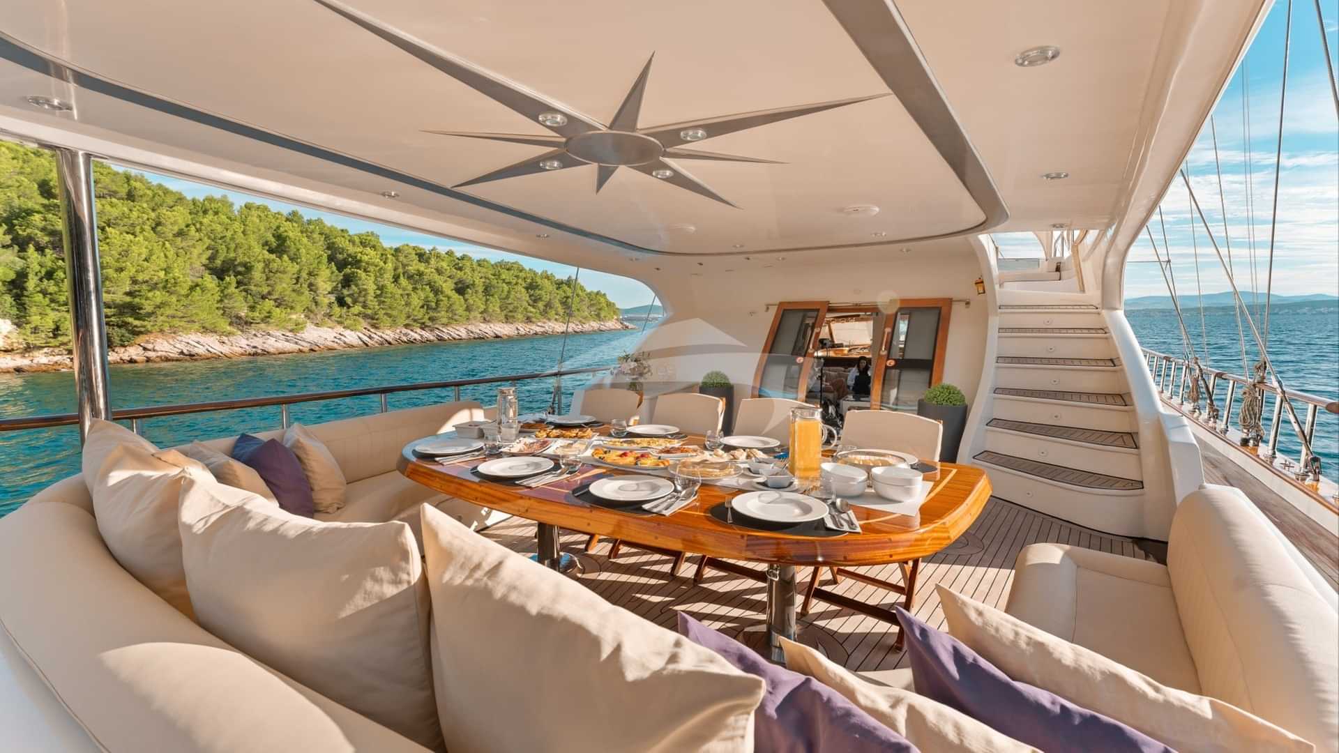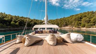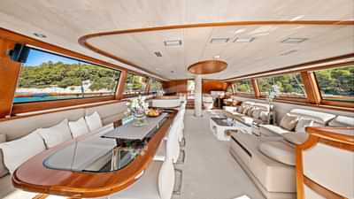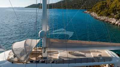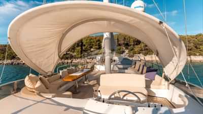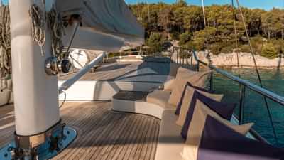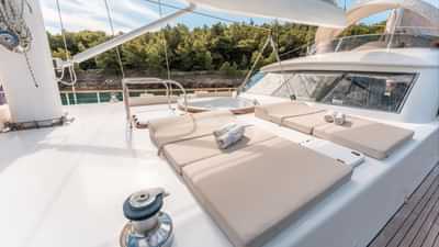 I servizi a bordo per gli ospiti charter includono aria condizionata, posti a sedere sul ponte di prua, vasca idromassaggio sul ponte e Wi-Fi.