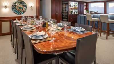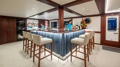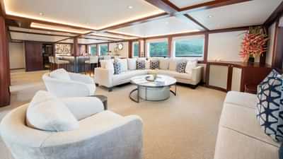 I servizi a bordo per gli ospiti charter includono aria condizionata, ascensore, attrezzatura da pesca leggera, vasca idromassaggio sul ponte, TV satellitare, stabilizzatori, piscina e Wi-Fi.