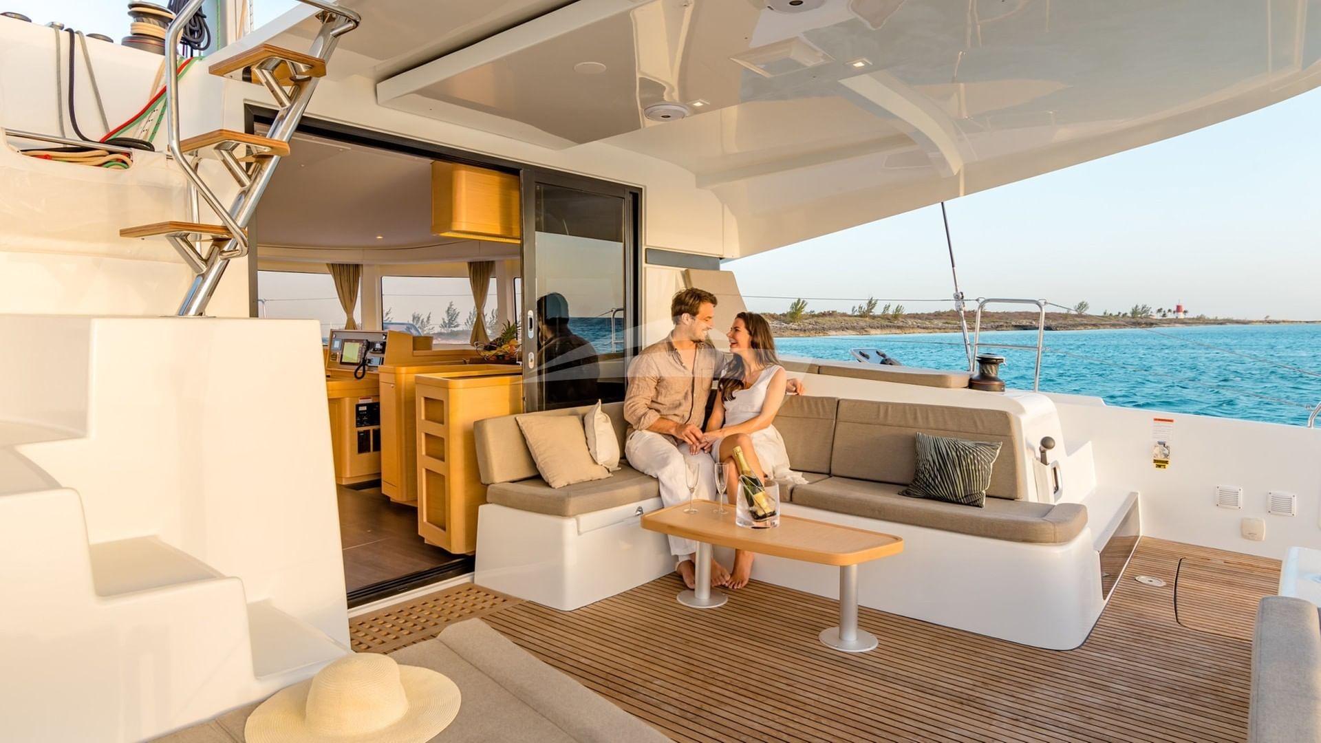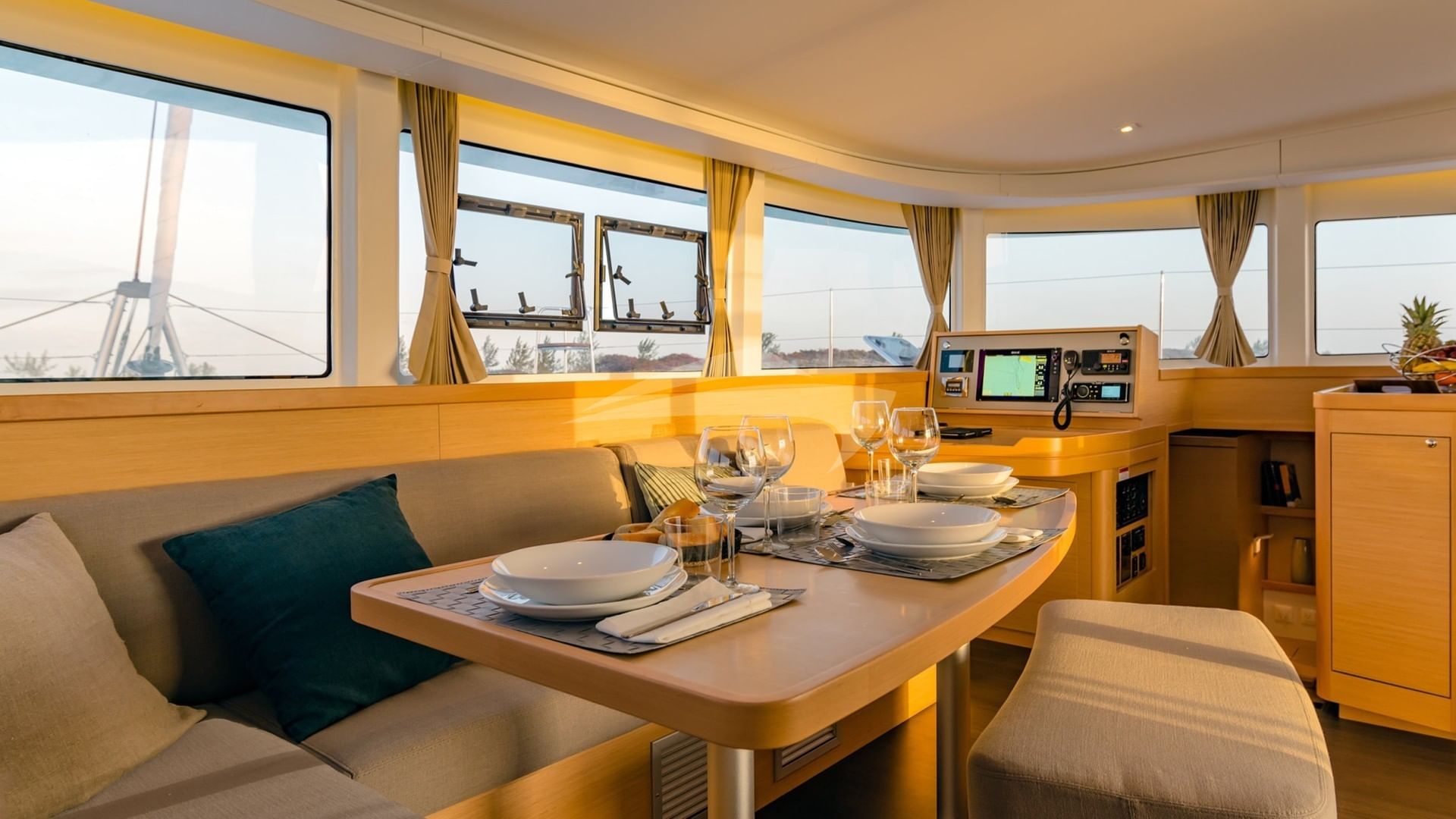 I servizi a bordo includono barbecue, macchina da caffè, doccia esterna, macchina per il ghiaccio, docking station per iPod, ombrelloni, piattaforma da nuoto, sala TV e bollitore d'acqua.