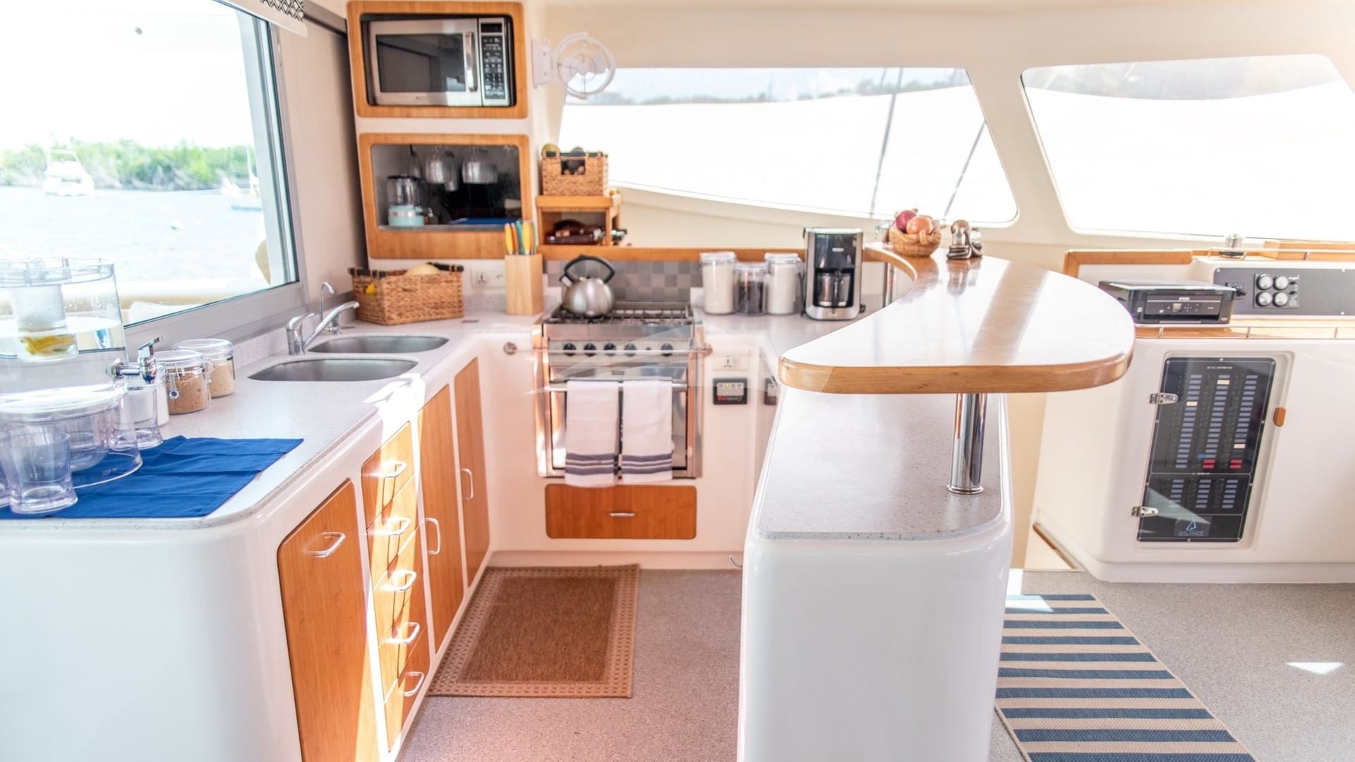 I servizi a bordo includono aria condizionata, barbecue, biblioteca, doccia esterna, attrezzatura da pesca leggera, impianto audio interno, docking station per iPod, comunicazioni satellitari, diete speciali, piattaforma da nuoto, sala TV e Wi-Fi.
