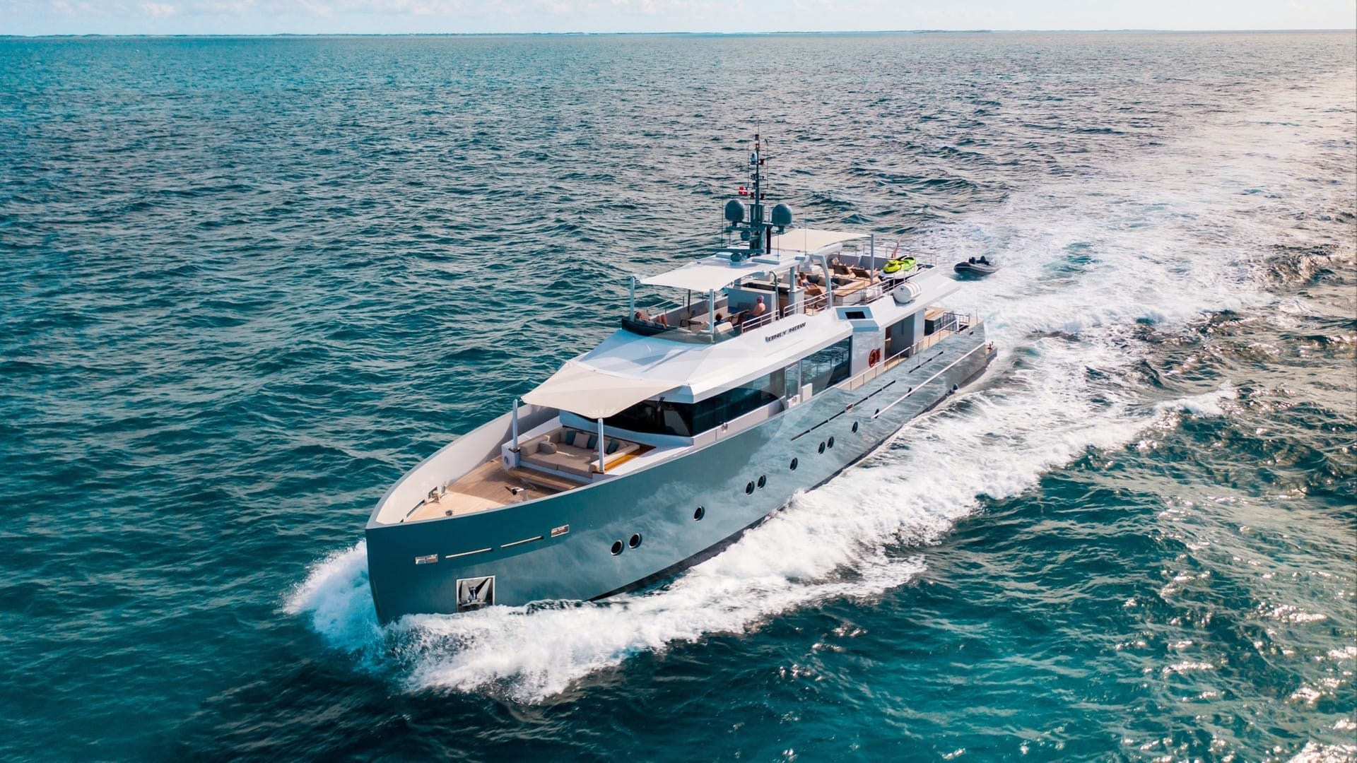 Il modello da 114 piedi/34,6 m SOLO ORA è stato costruito con uno scafo in legno ed è alimentato da 2 motori diesel Caterpillar (C-32) da 1.700 CV con una velocità di crociera di 13 nodi e una velocità massima di 21 nodi.