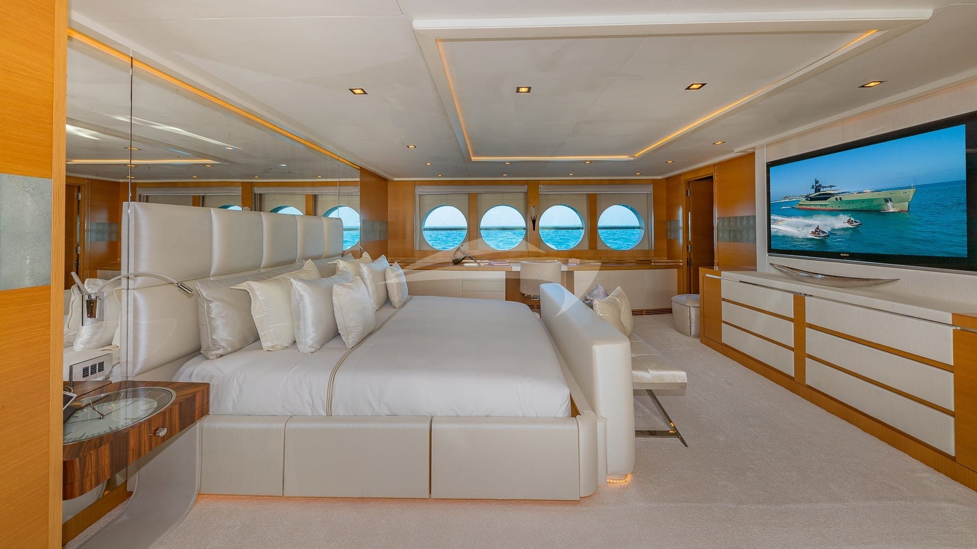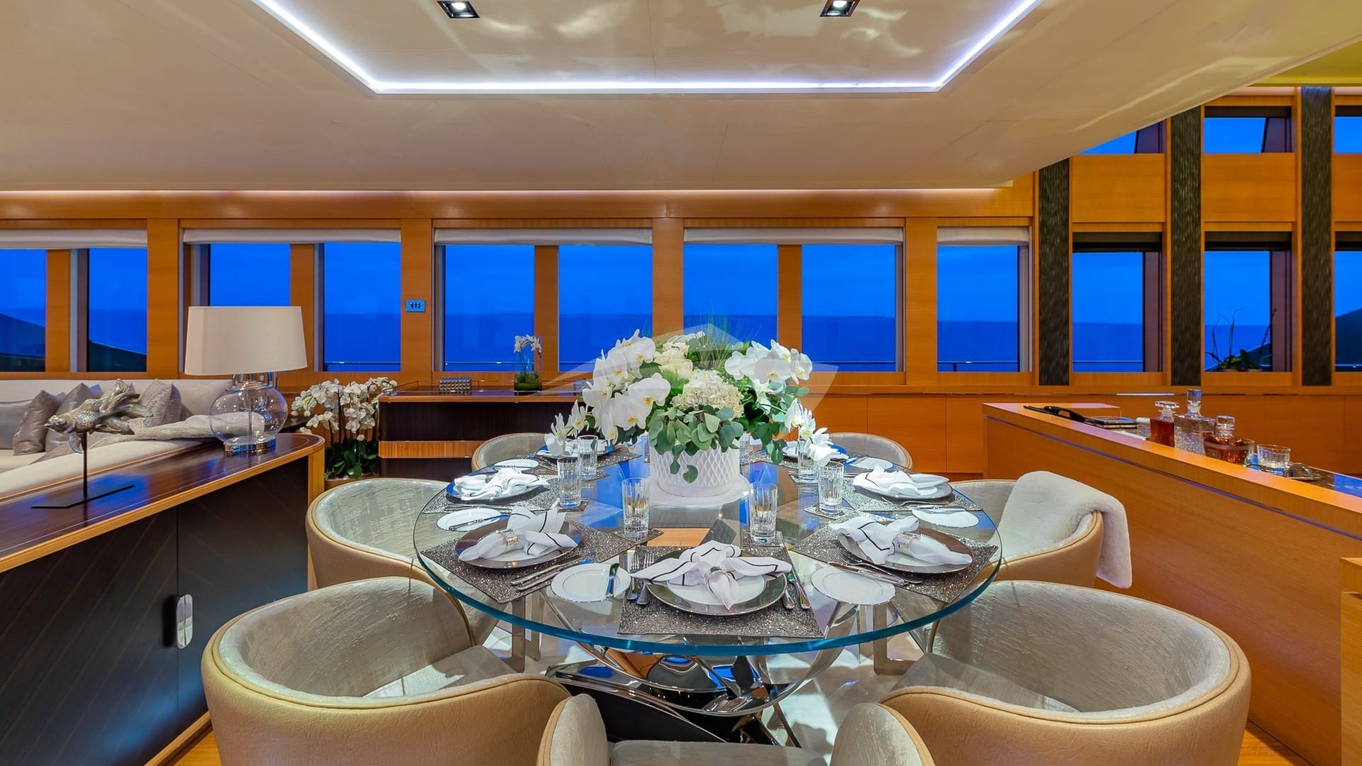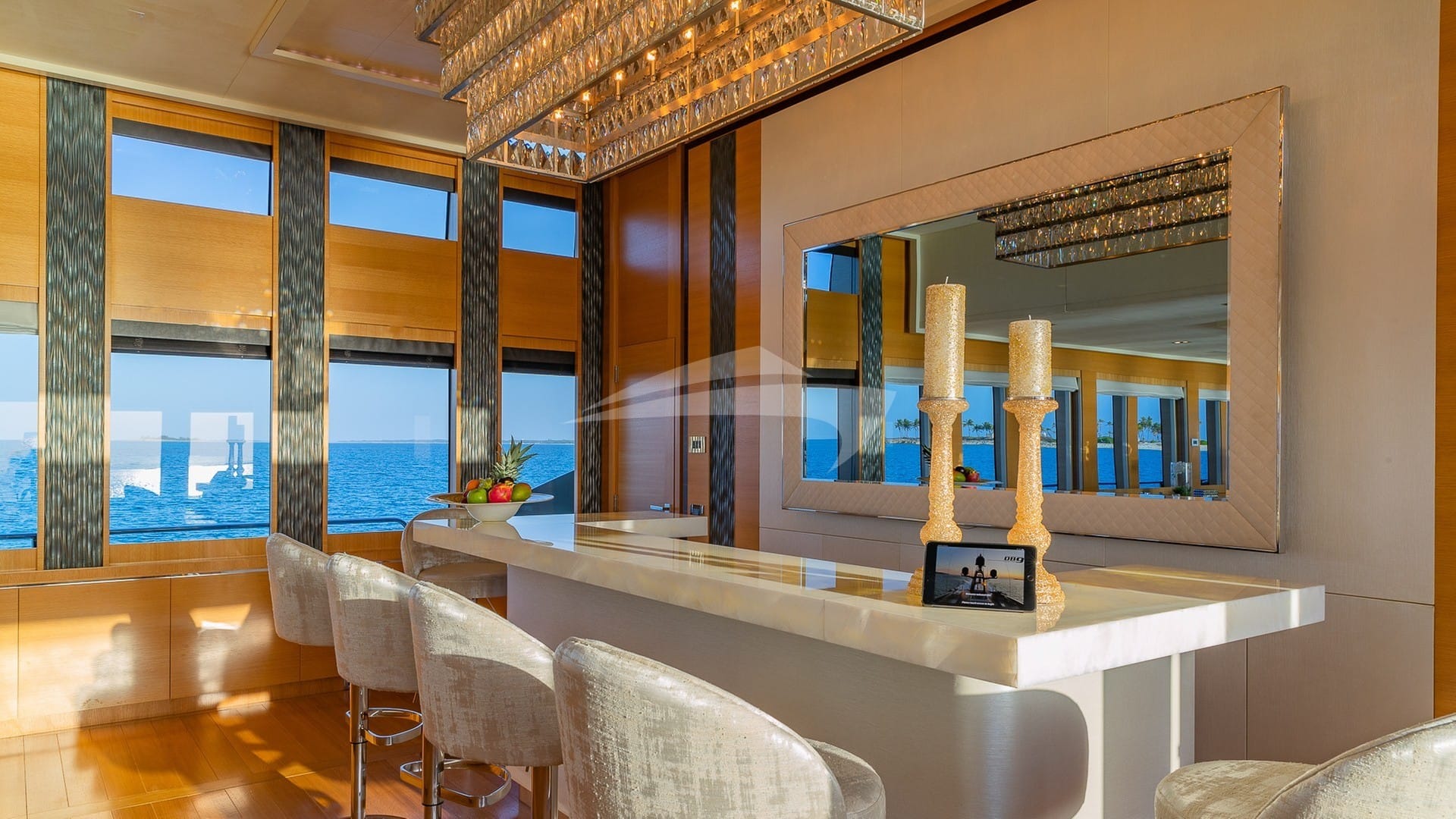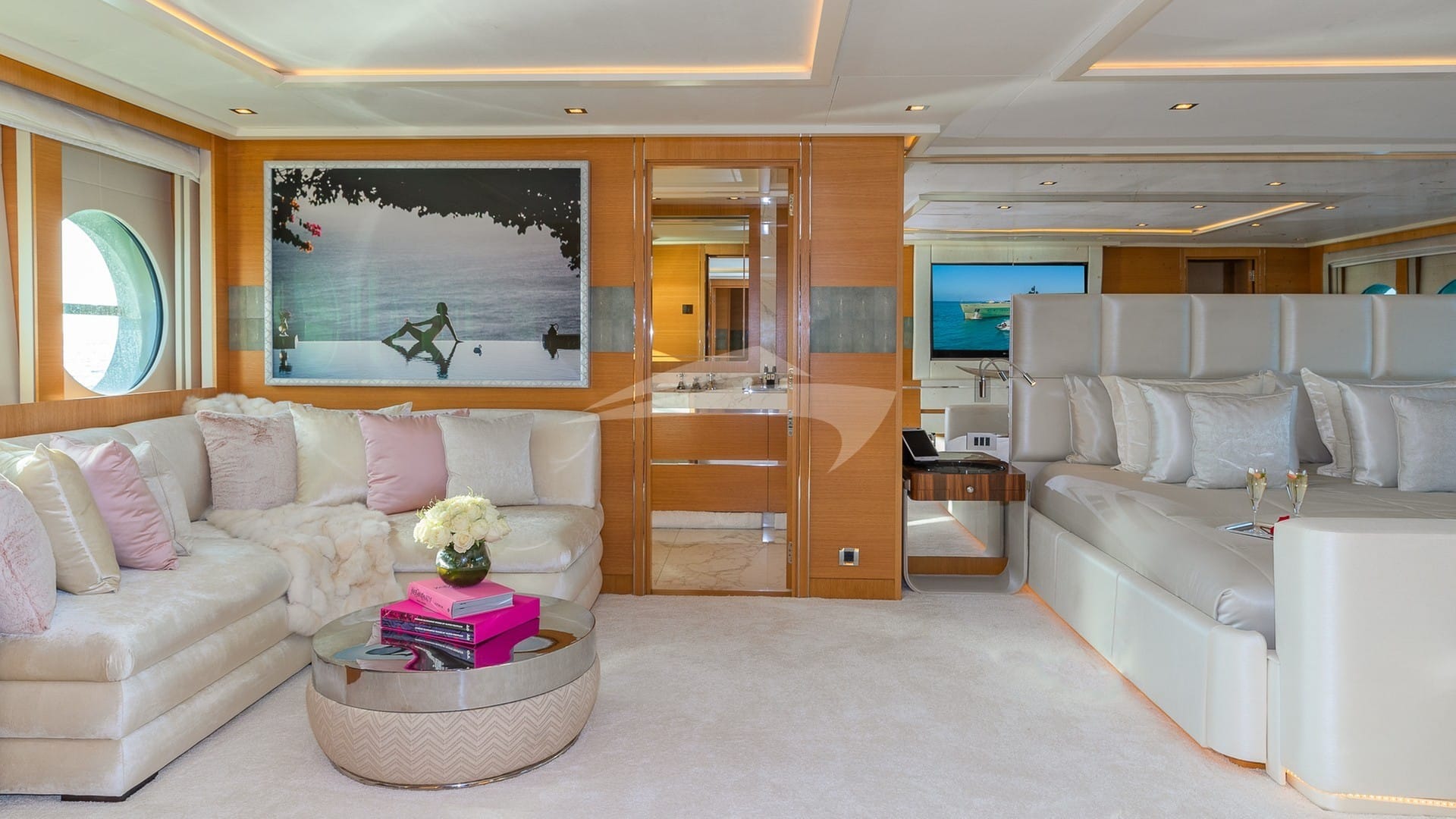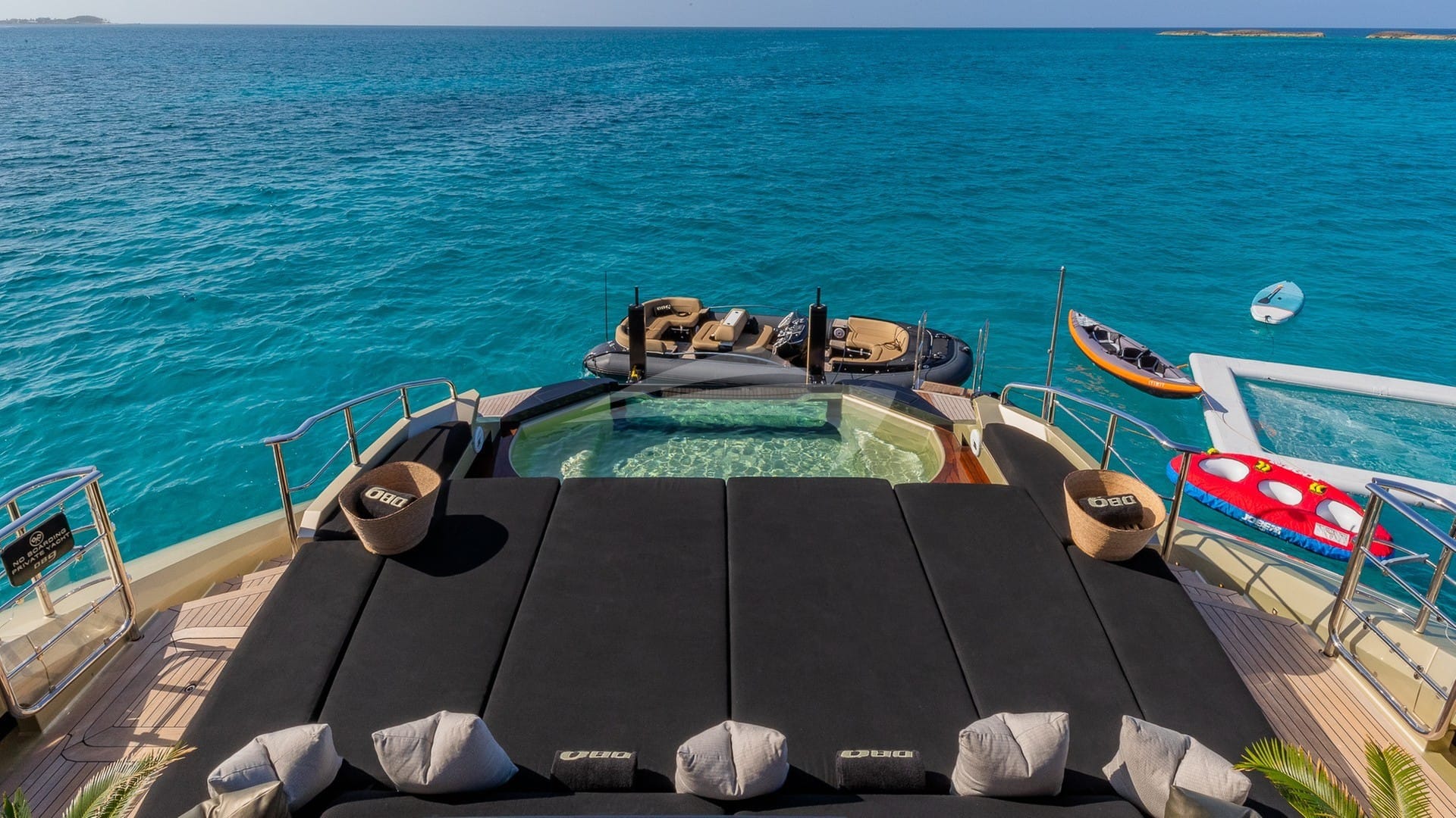 I servizi a bordo per gli ospiti charter includono aria condizionata, barbecue, attrezzatura sportiva, attrezzatura da pesca leggera, palestra, vasca idromassaggio sul ponte, sistema audio esterno, stabilizzatori all'ancora, lettini prendisole, lettini prendisole, piattaforma da nuoto, piscina, TV tutte le cabine, TV esterna e Wi-Fi.