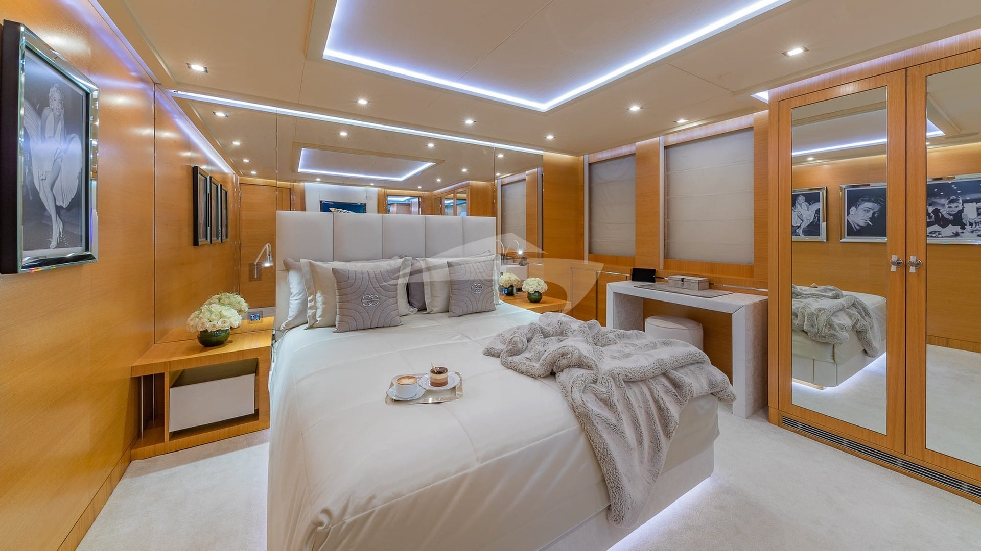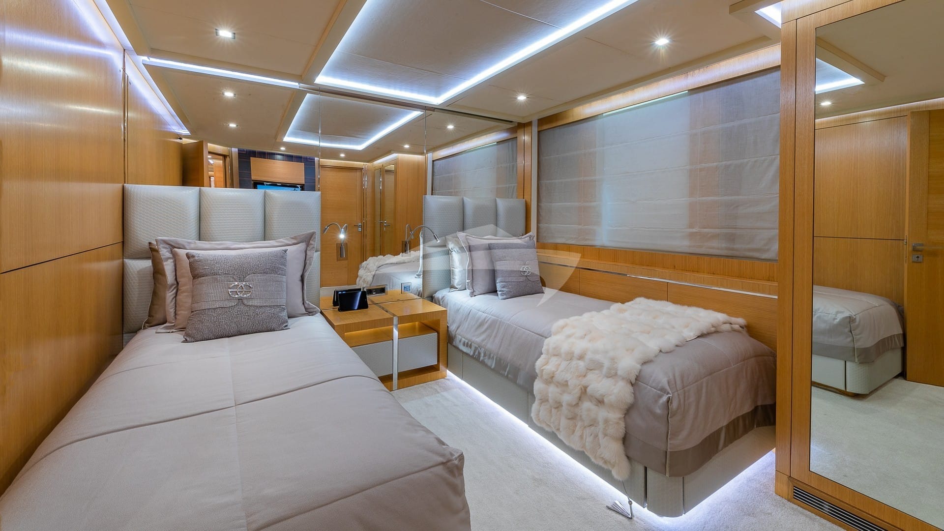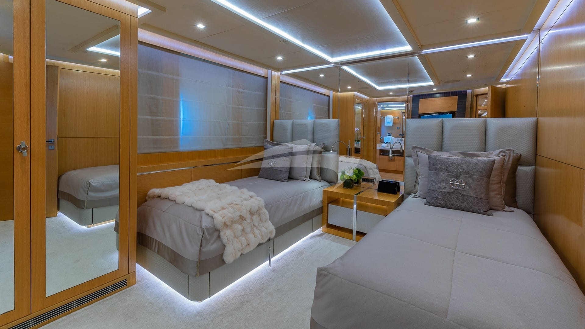 Le cabine ospiti comprendono una suite principale con letto king size e bagno privato, 2 cabine con letto matrimoniale e bagno privato, una suite VIP con letto matrimoniale e bagno privato e una cabina con letto matrimoniale e bagno privato e una cabina con letto matrimoniale e bagno privato.