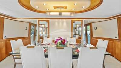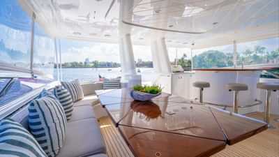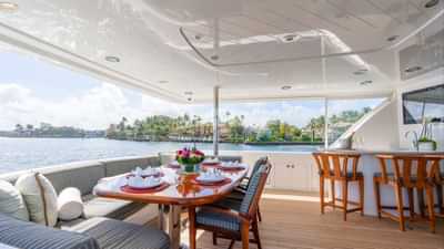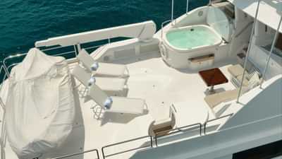 チャーターゲスト用の機内アメニティには、エアコン、バーベキュー、軽釣具、屋内オーディオシステム、iPodドック、デッキのジャグジー、屋外バー、衛星テレビ、スタビライザー、スターリンク衛星インターネット、サンパッド、サンデッキ、スイムプラットフォーム、テレビサルーン、Wi-Fiが含まれます。