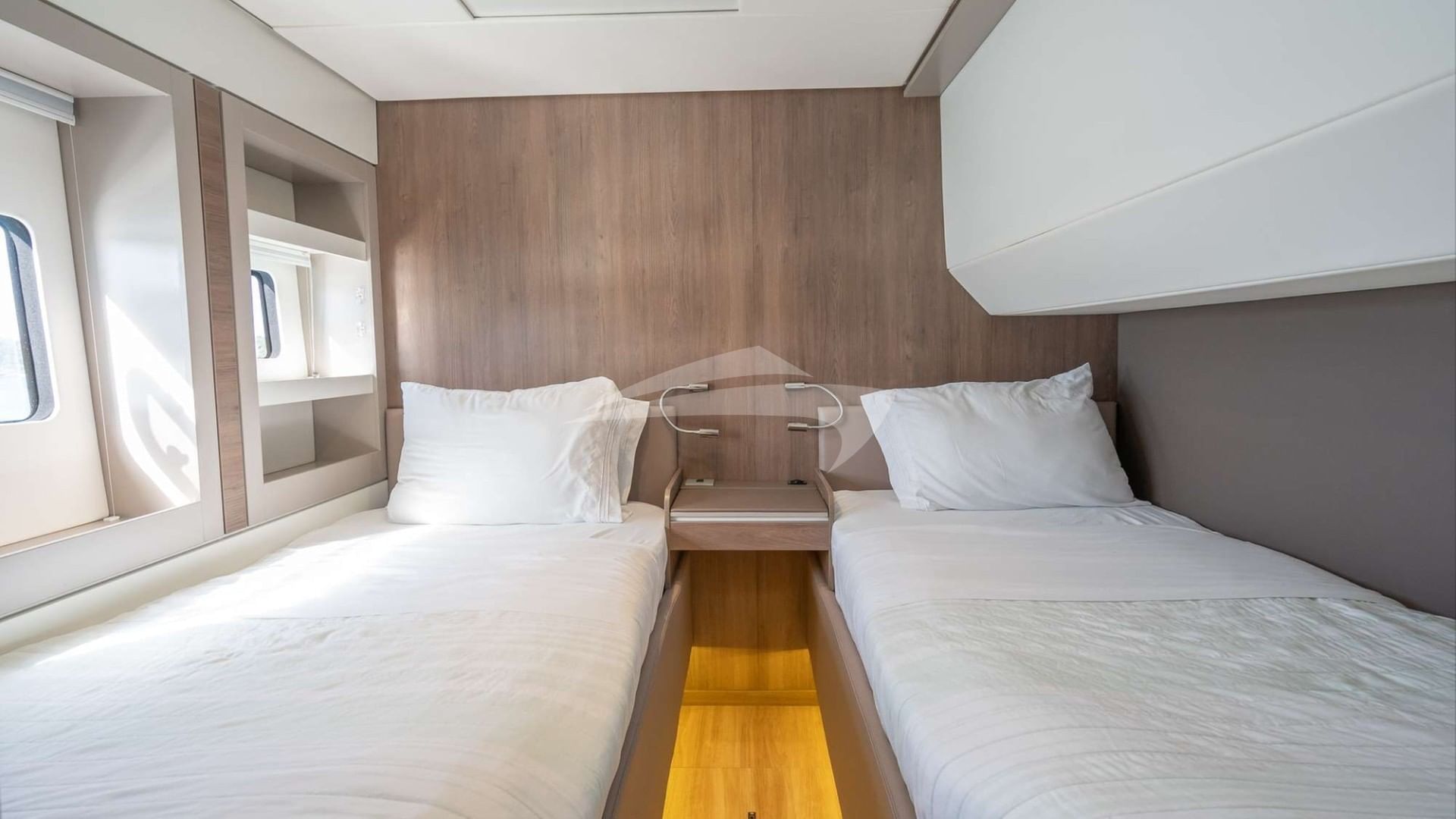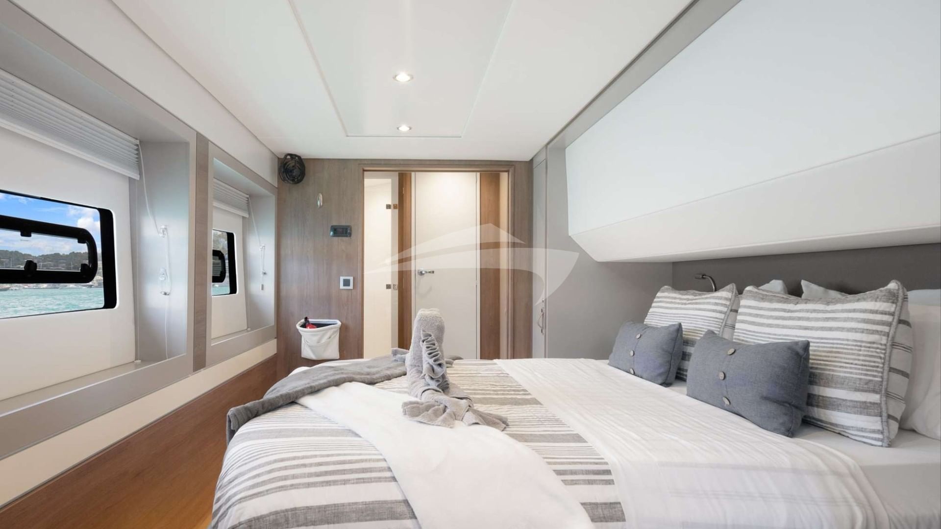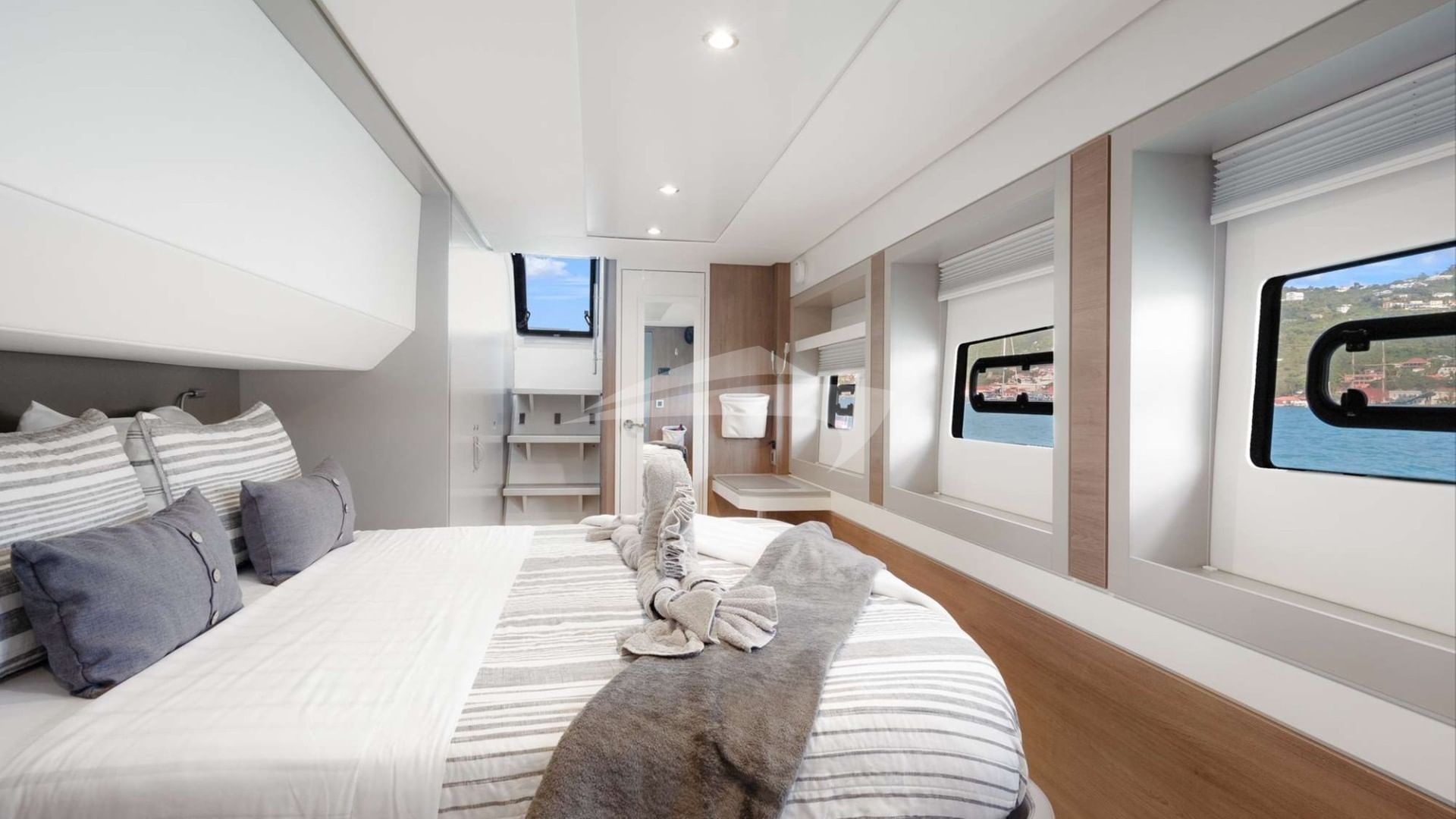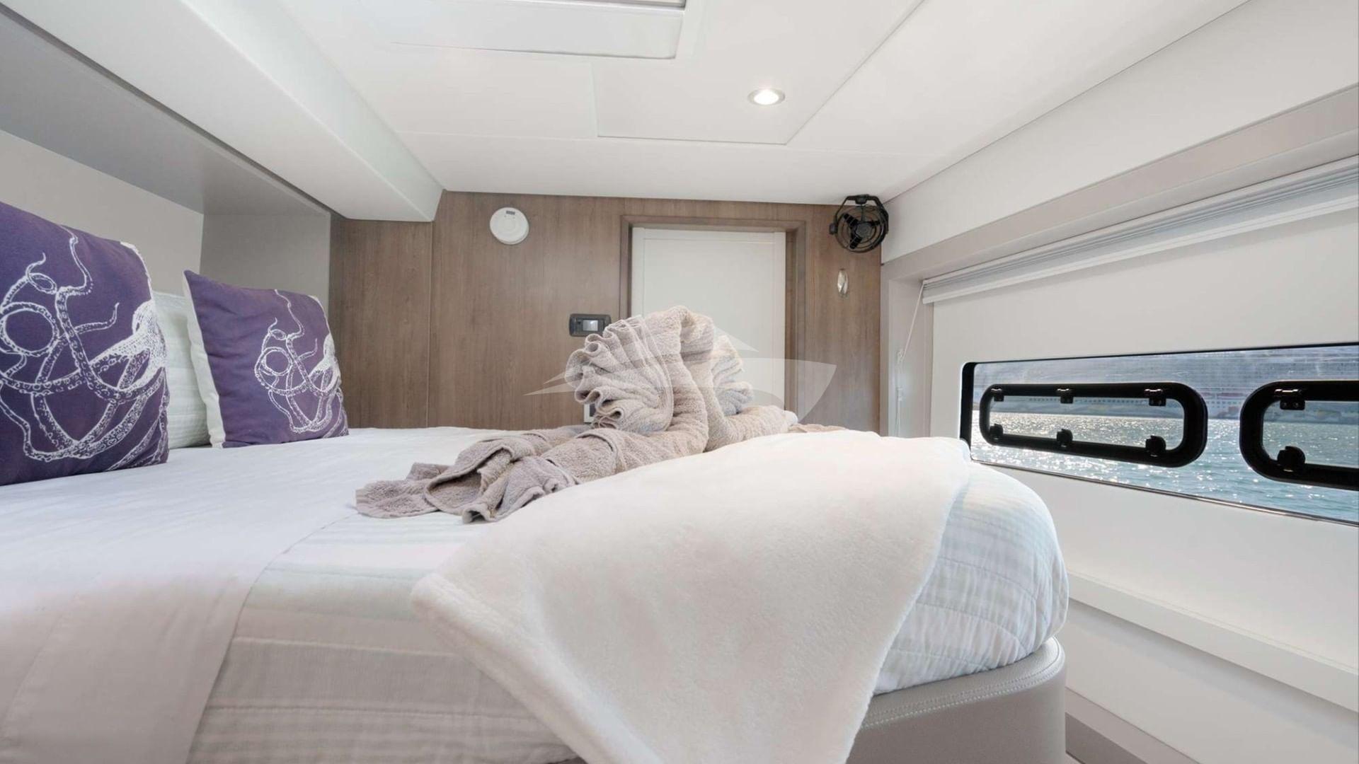 ゲストキャビンは、後方にクイーンサイズベッドと専用バスルーム設備を備えたプライマリースイート、クイーンサイズベッドと専用バスルーム付きのキャビン3室、シングルベッド1台と専用バスルーム付きのキャビン2室で構成されています。