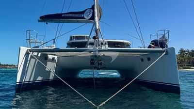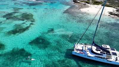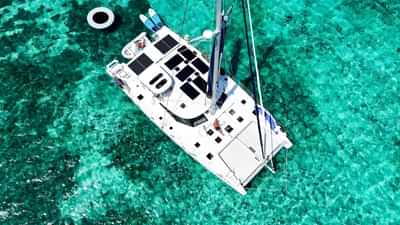 Reaching in a gentle breezeSaloon seatingGalley and saloonAft deck seatingCockpit tableBroad aft deck and cockpitStarboard aft king suitePort forward queen suitePort aft kings suiteStarboard forward queen suiteStarboard forward queen suiteHelm stationAft cockpitFish On!Floating Sun IslandAn Office with a ViewPaddleboard playSun loungersAwatea at Pipe Cay