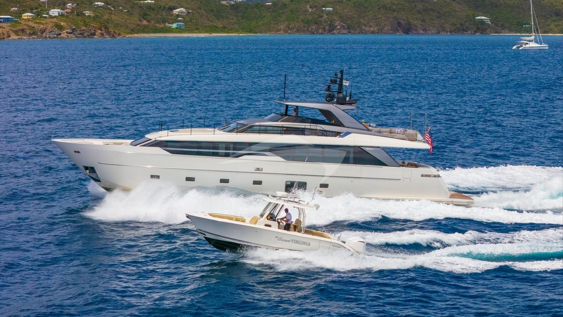 96フィート/29.3mのSWEET VIRGINIGIAはグリップハルで構築されており、2 x MTU V16 2400馬力を動力源としており、巡航速度は20ノット、最高速度は32ノットです。