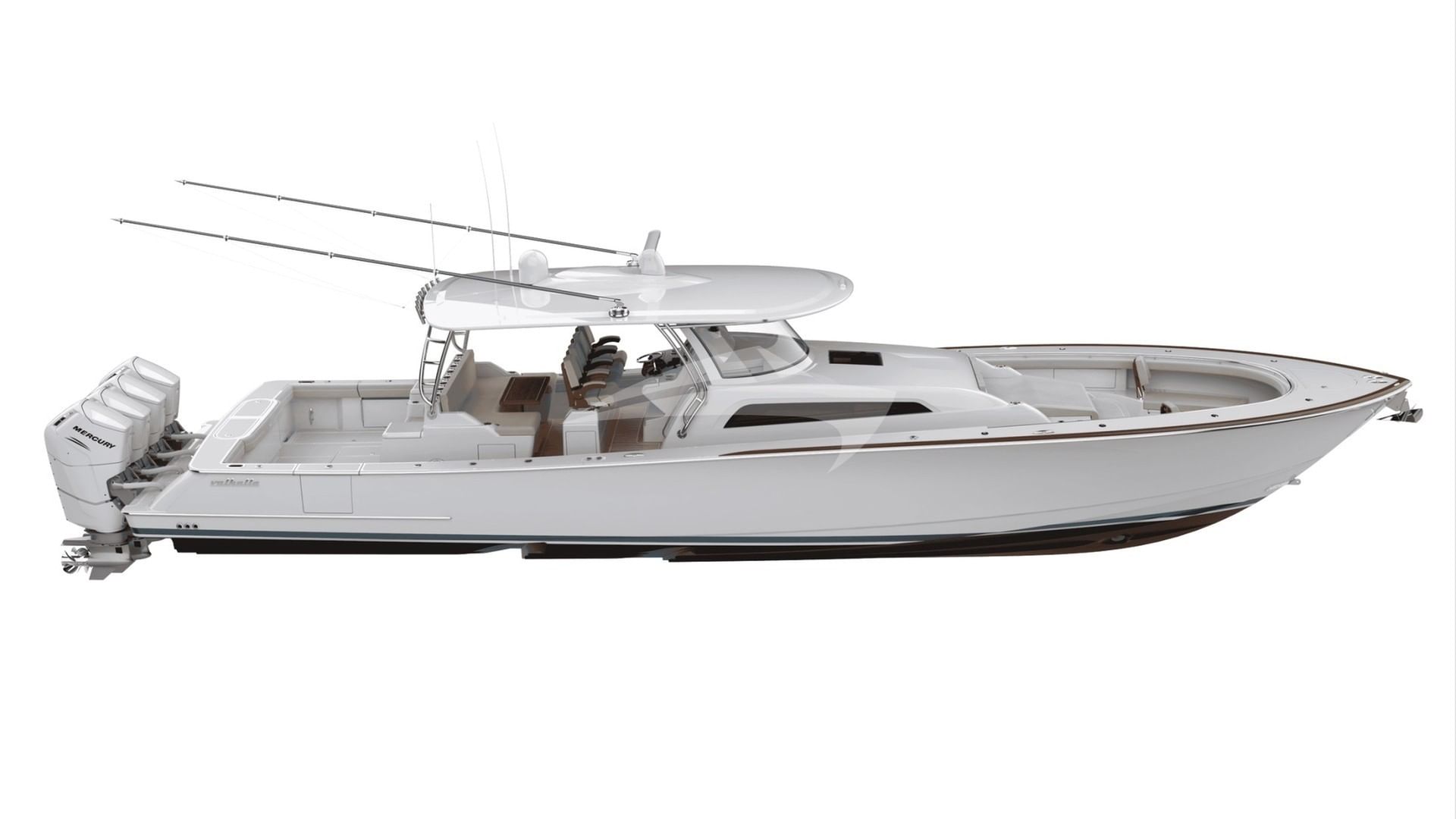 55フィート/16.9m V55はカーボン製の船体を採用し、巡航速度30ノット、最高速度60ノットのクアッド・マーキュリー・ベラード600sを動力源としています。