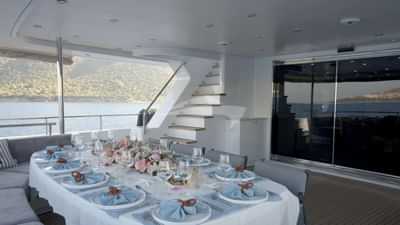チャーターゲスト用の機内設備には、エアコン、屋外シャワー、屋内オーディオシステム、アンカー付きスタビライザー、テレビサロンなどがあります。