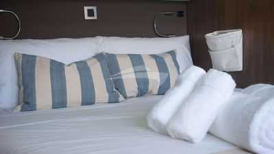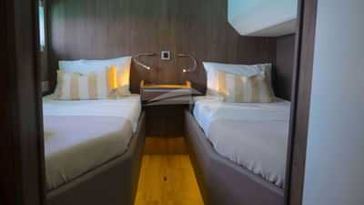 ゲストキャビンには、ダブルベッド1台、プルマンベッド1台、専用バスルーム付きのプライマリスイート、ダブルベッド1台、専用バスルーム付きのキャビン3室があります。