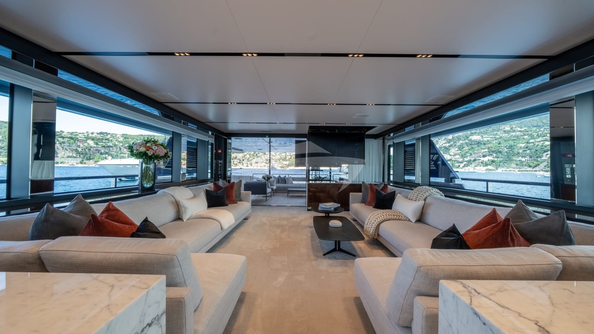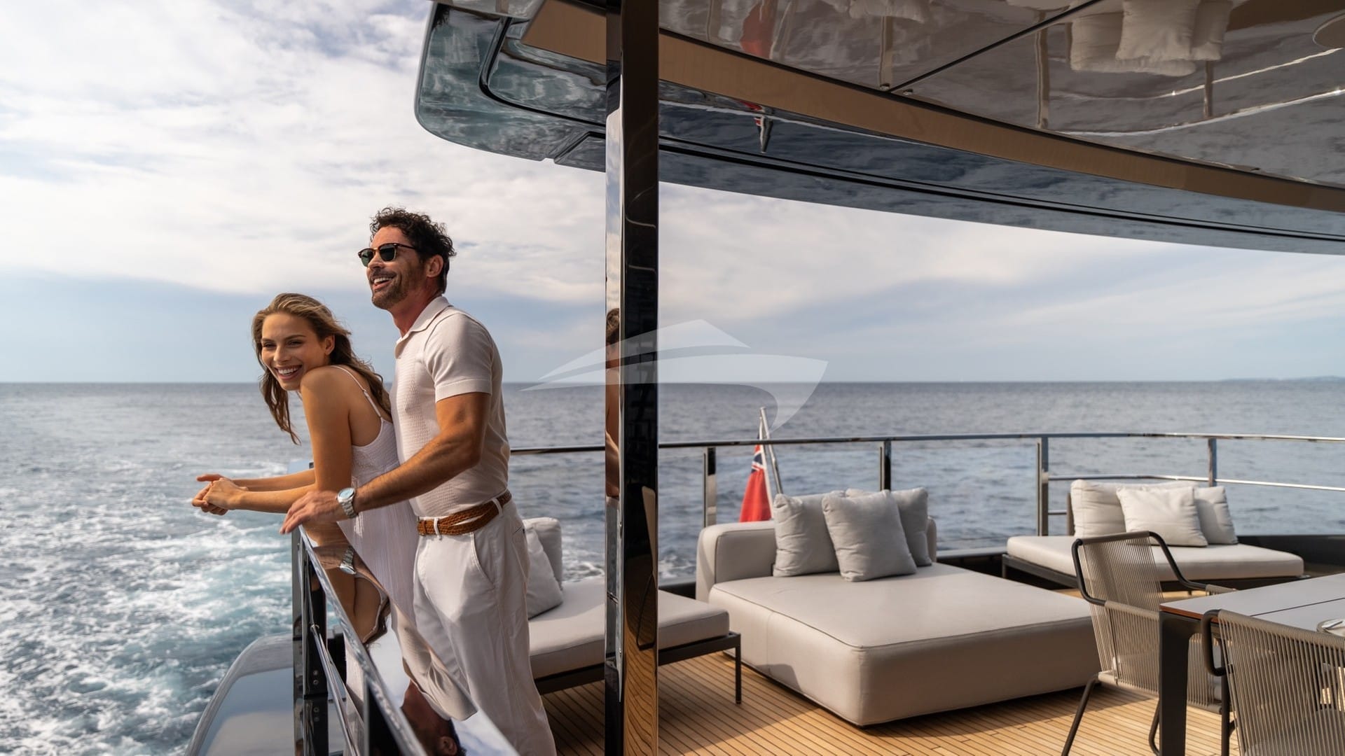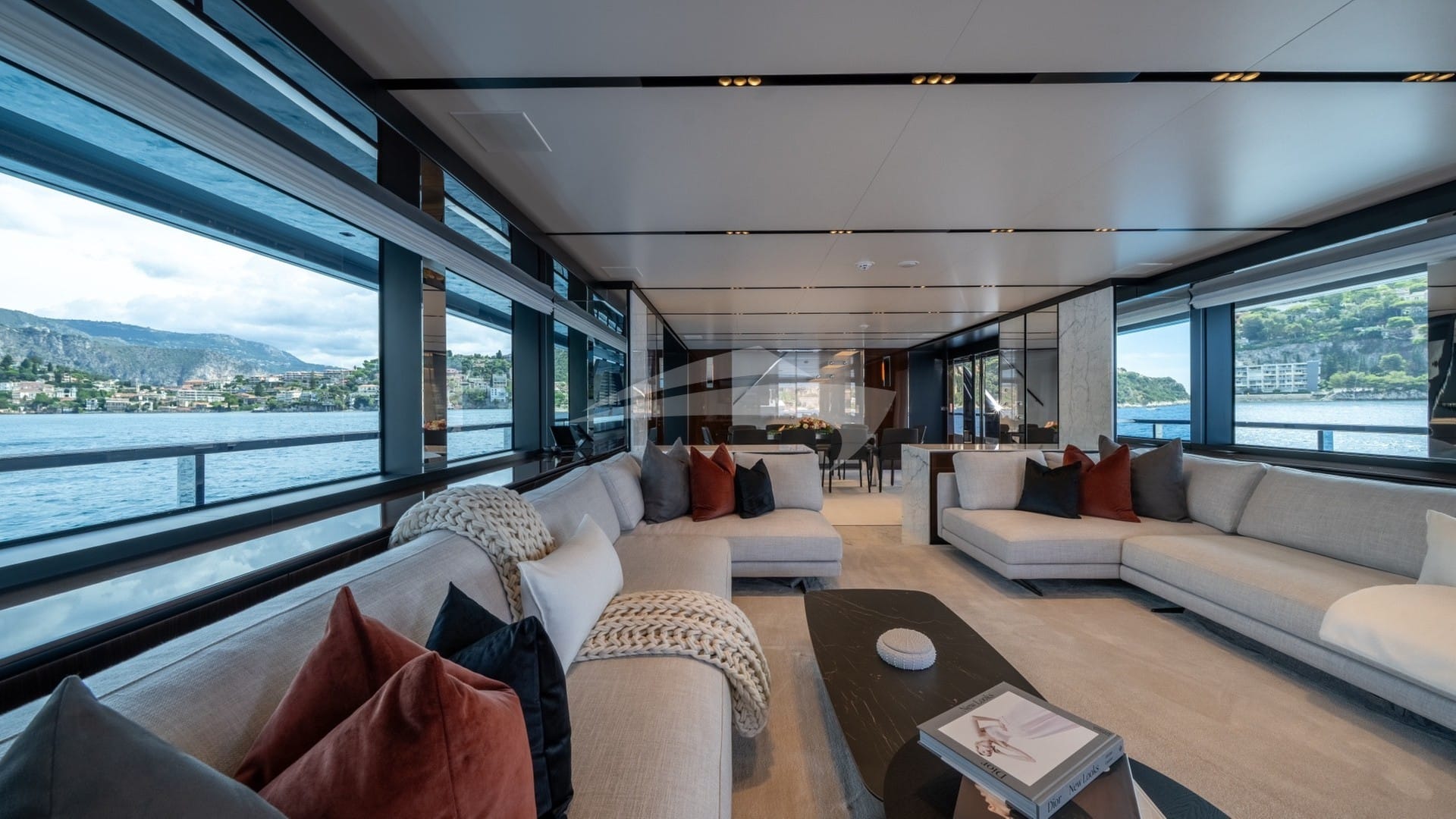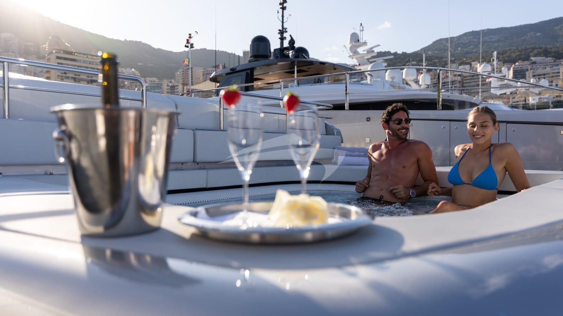 チャーターゲスト用の機内アメニティには、エアコン、屋外シャワー、ジム、屋内オーディオシステム、デッキのジャグジー、アンカー付きスタビライザー、スイムプラットフォーム、テレビサルーン、Wi-Fiが含まれます。