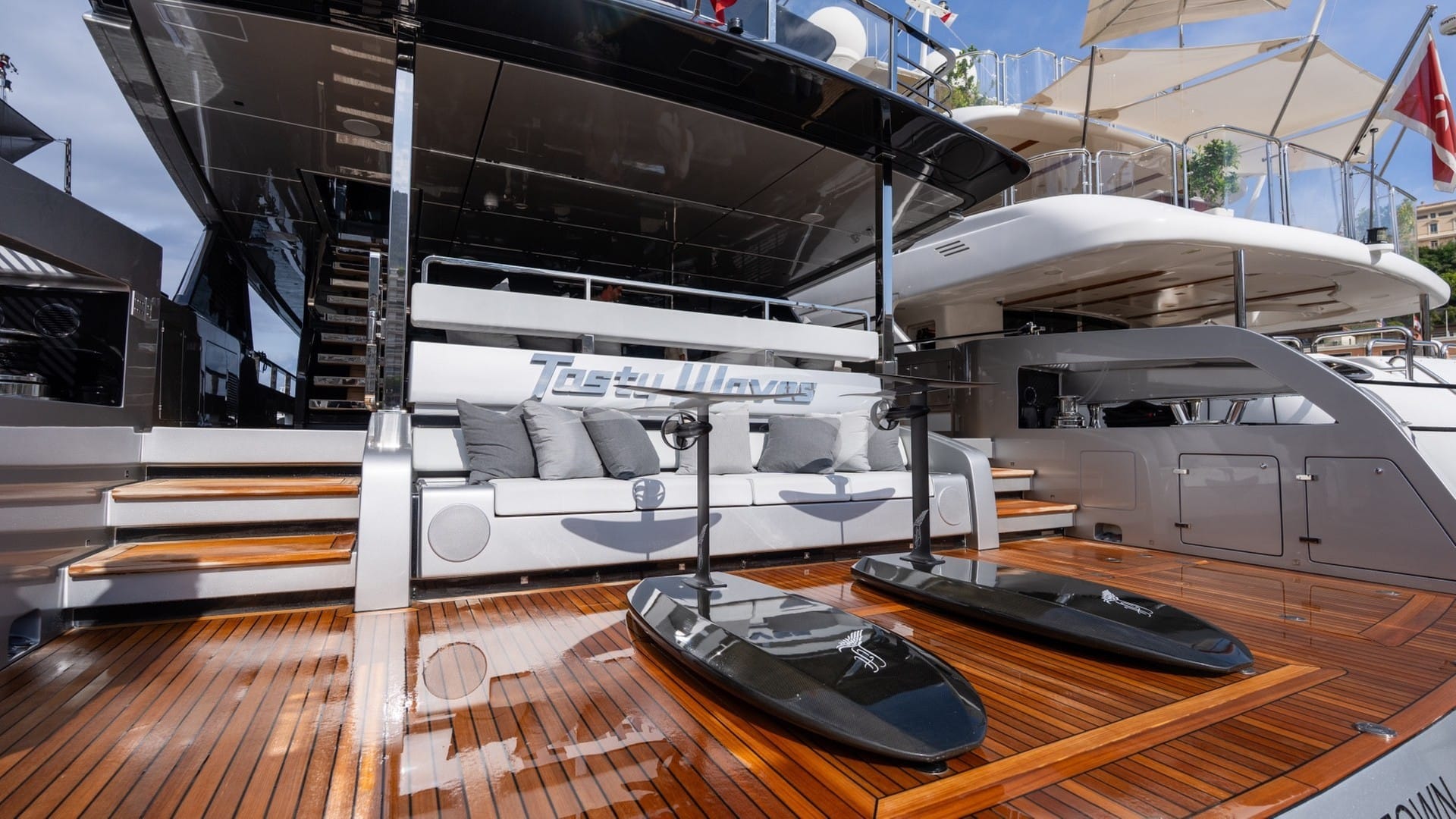 131フィート/39.9mのTASTY WAVESはグリップ船体で構成され、巡航速度17ノット、最高速度20ノットの2 MTU M96Lを動力源としています。