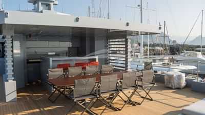 チャーターゲスト用の機内アメニティには、エアコン、バーベキュー、屋外シャワー、軽釣具、ジム、屋内オーディオシステム、デッキのジャグジー、テレビサルーン、Wi-Fiが含まれます。