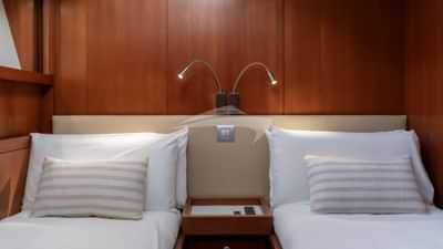 ゲストキャビンには、プライマリスイート(クイーンサイズベッド、専用バスルーム付)、クイーンサイズベッドと専用バスルーム設備付きのキャビン、ダブルベッド、専用バスルーム付きのキャビン、ツインベッド、専用バスルーム設備が備わります。