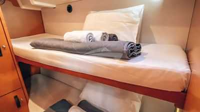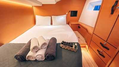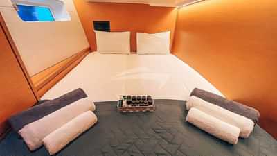 ゲストキャビンには、ダブルベッド1台と専用バスルーム付きのプライマリースイート、ダブルベッド1台と専用バスルーム付きのキャビン2室、シングルベッド1台とプルマンベッド、専用バスルーム付きのキャビンがあります。