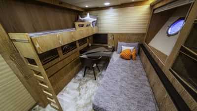 ゲストキャビンには、ダブルベッド1台付きのプライマリスイート、ダブルベッド1台付きのキャビン、ツインベッド付きのキャビン2室があります。