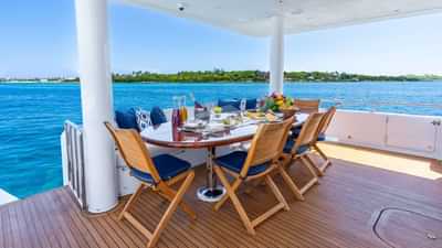 チャーターゲスト用の機内アメニティには、エアコン、バーベキュー、屋外シャワー、ジム、屋内オーディオシステム、デッキのジャグジー、スタビライザー、スイムプラットフォーム、テレビサルーン、Wi-Fiが含まれます。