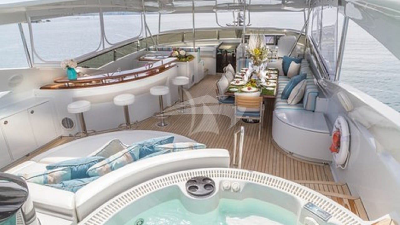 チャーターゲスト用の機内アメニティには、エアコン、大型釣具、屋内オーディオシステム、プライマリキャビンのジャグジー、デッキのジャグジー、衛星通信、衛星テレビ、スタビライザー、サンパッド、テレビプライマリキャビン、Wi-Fiが含まれます。
