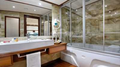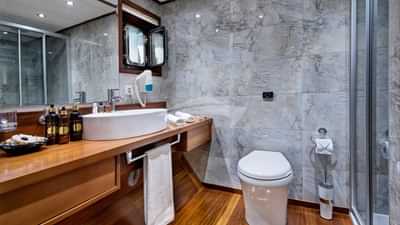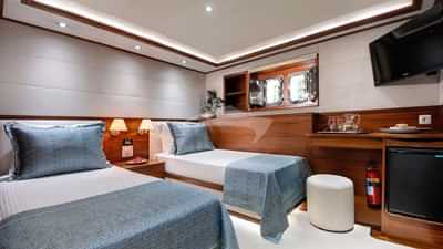 ゲストキャビンには、プライマリスイート(ダブルベッド1台、専用バスルーム付)、ダブルベッド1台、専用バスルーム付きのキャビン3室、ツインベッド、専用バスルーム設備が備わります。