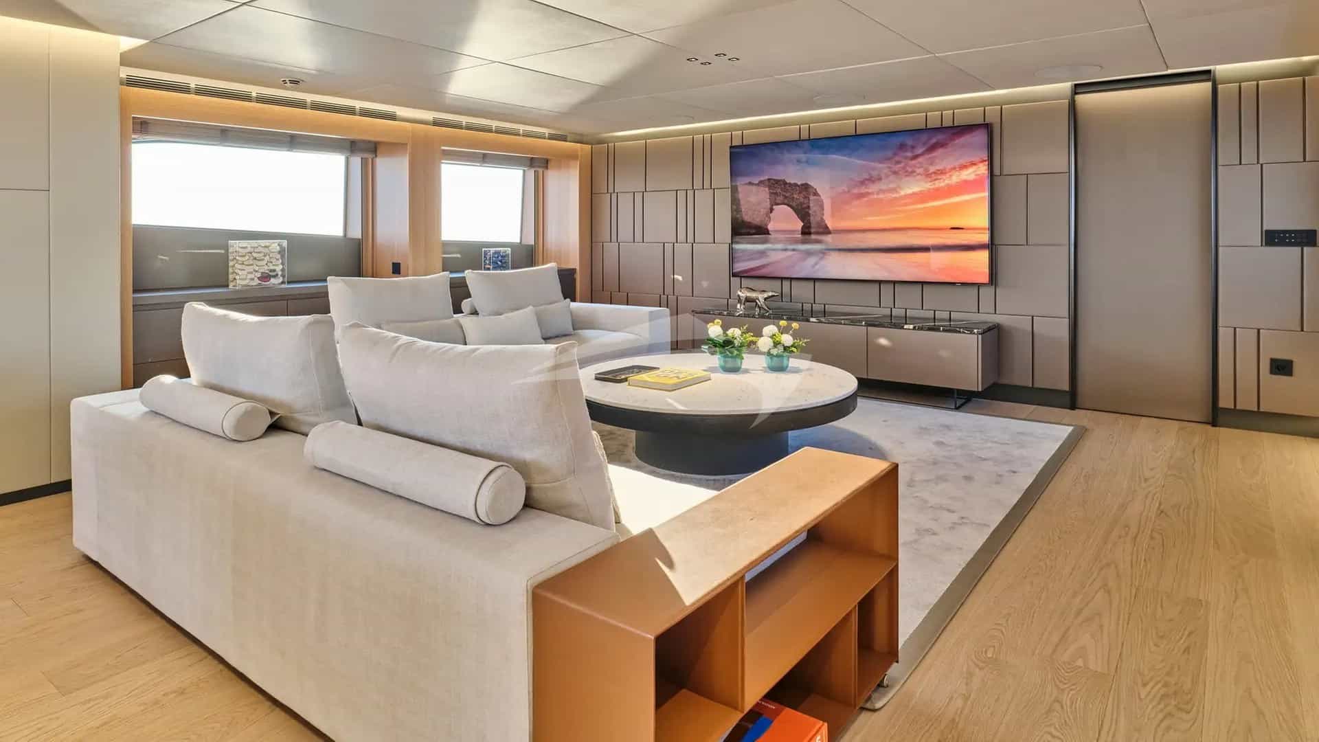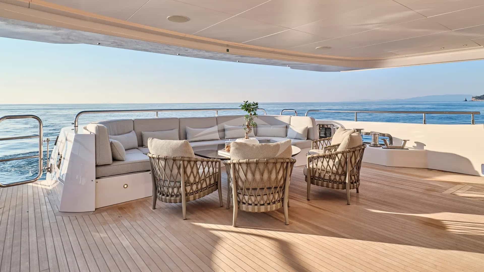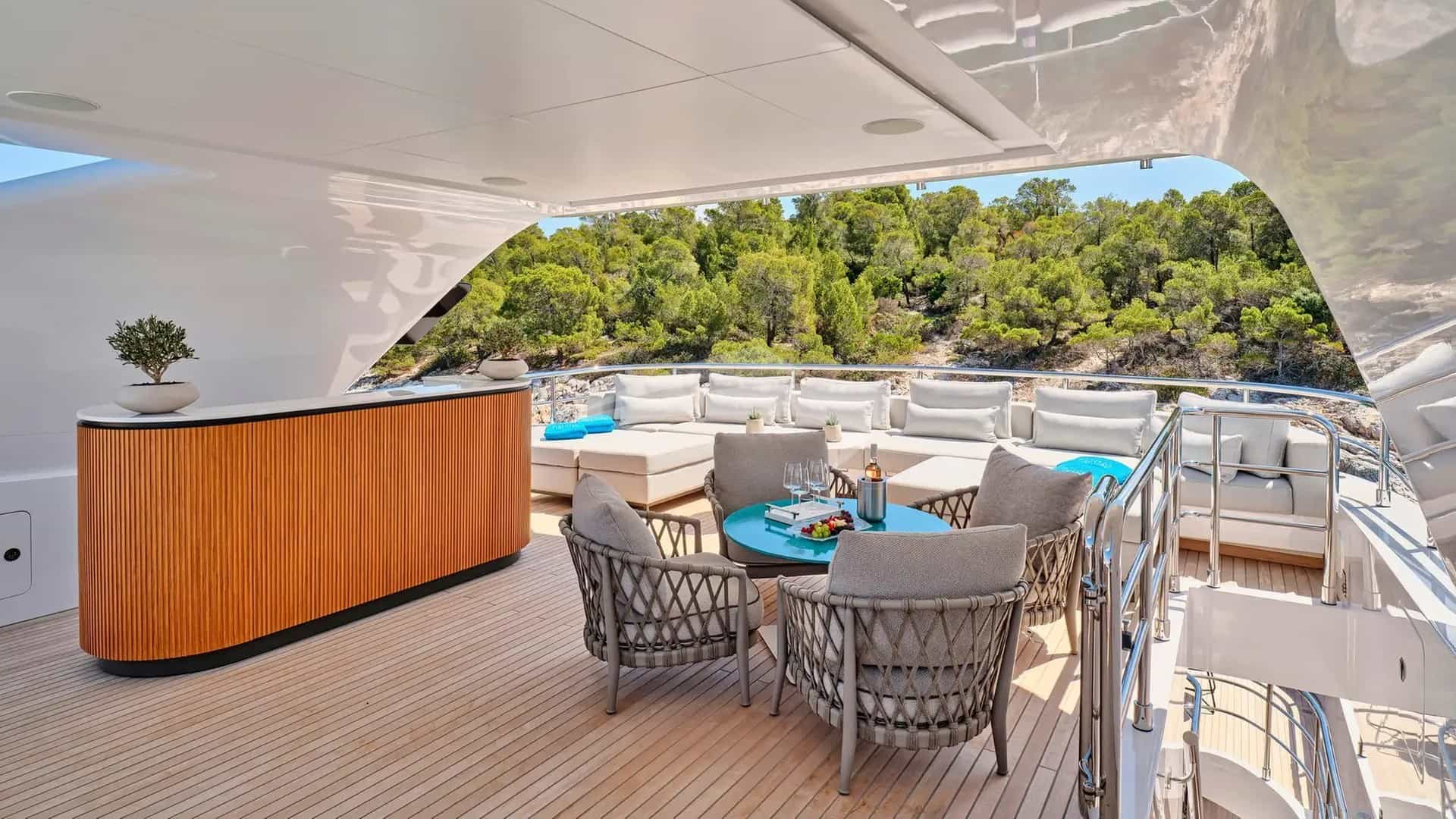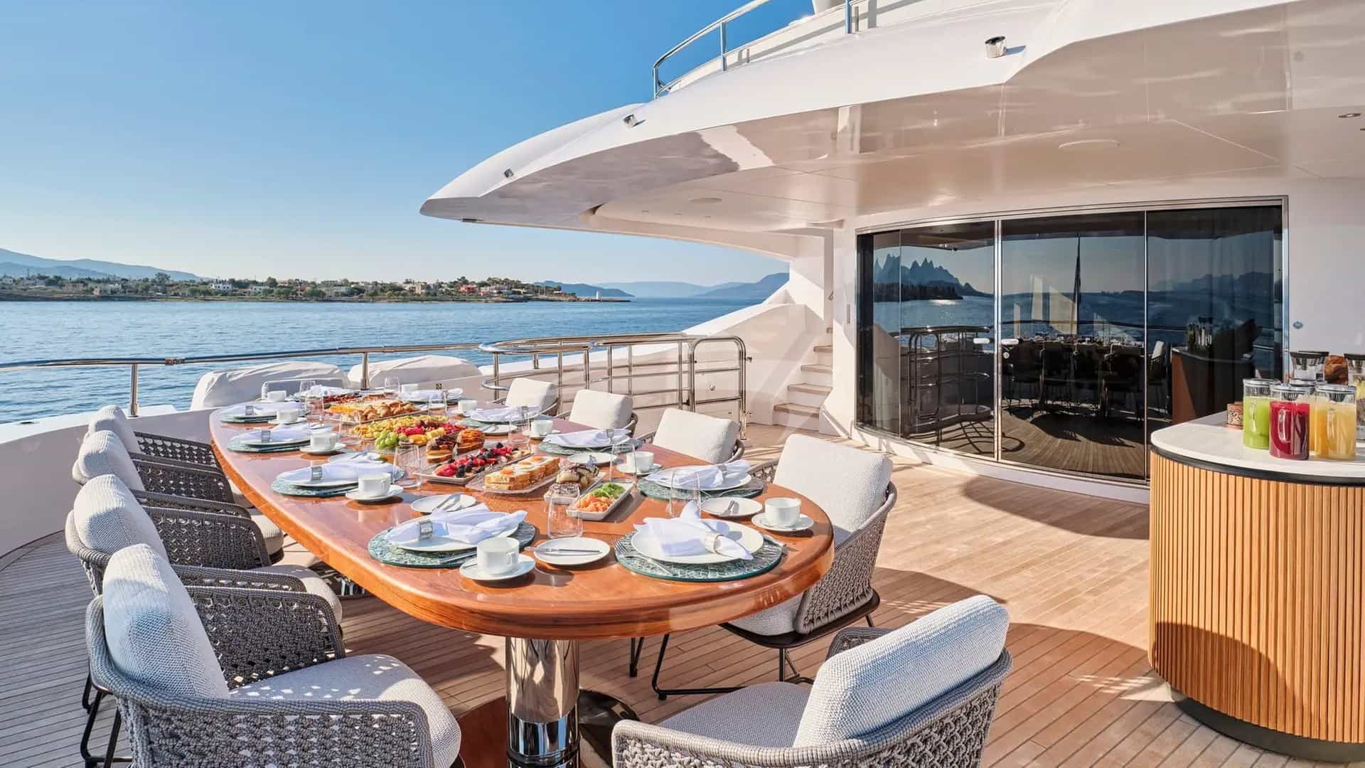 チャーターゲスト用の機内アメニティには、エアコン、運動器具、軽釣具、屋内オーディオシステム、デッキのジャグジー、衛星テレビ、アンカー付きスタビライザー、Wi-Fiが含まれます。