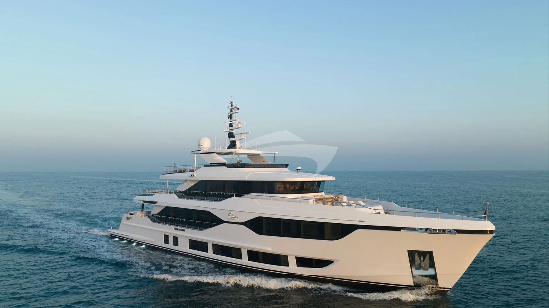 123フィート/37.6mのOLIVIAはGRP船体で構築されており、巡航速度13ノット、最高速度21ノットの2x MTUエンジンを搭載しています。