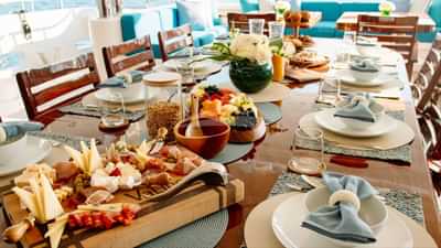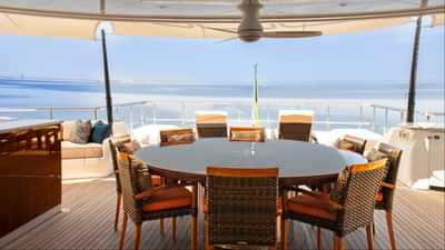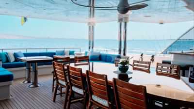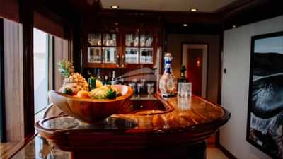 チャーターゲスト用の機内アメニティには、エアコン、バーベキュー、軽釣具、ヘリポート、デッキのジャグジー、衛星テレビ、スタビライザー、Wi-Fiが含まれます。