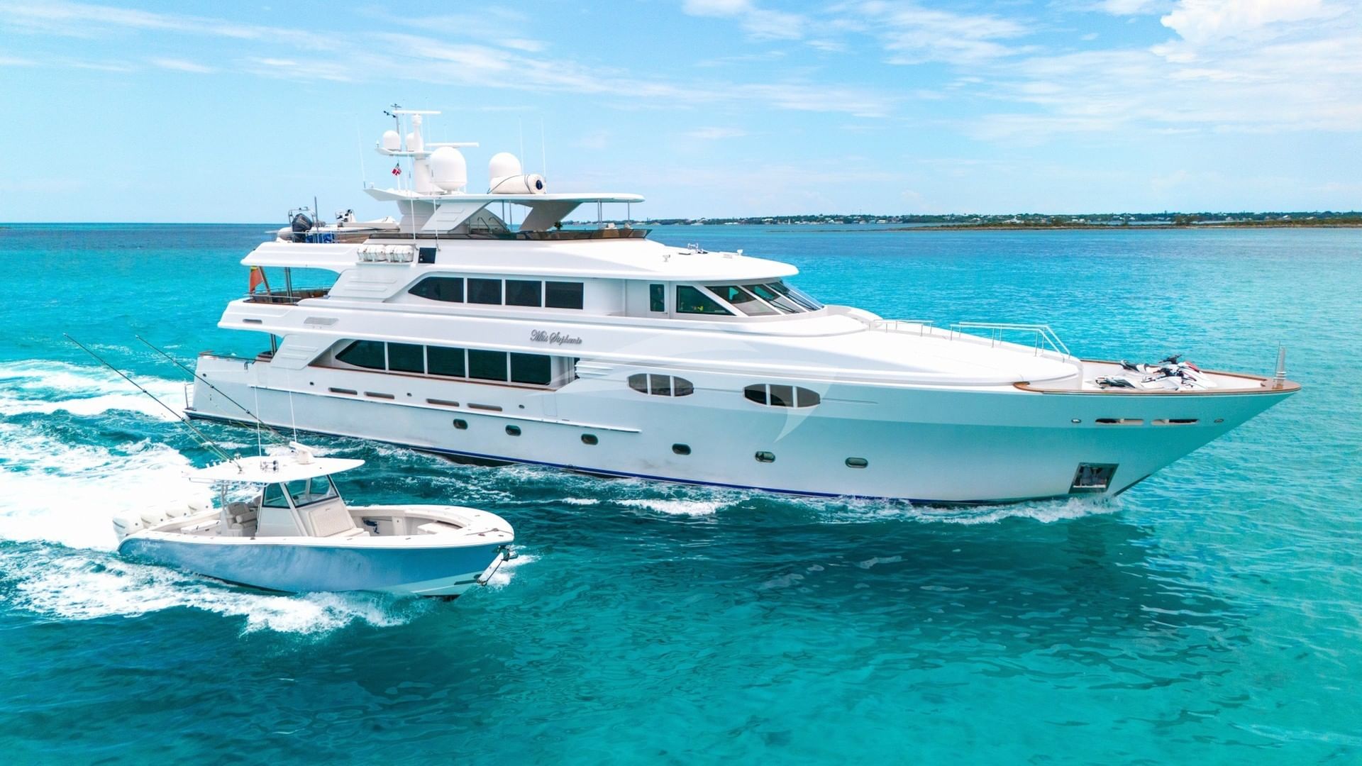 機内のアメニティには、エアコン、ビーチクラブ、屋外シャワー、大型釣り用品、メインキャビンのジャグジー、デッキのジャグジー、デッキのジャグジー、屋外オーディオシステム、アンカー付きスタビライザー、スイムプラットフォーム、屋外テレビ、Wi-Fiなどがあります。