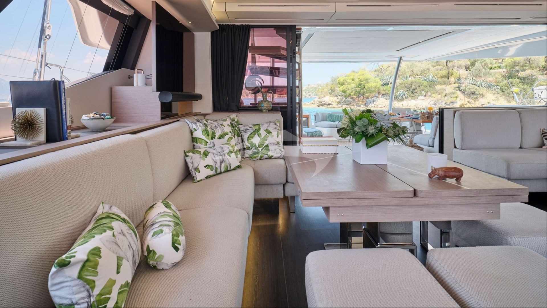 As comodidades a bordo para os hóspedes charter incluem ar condicionado, equipamento de pesca leve, sistema de áudio interno, jacuzzi no convés, TV via satélite, salão de TV e Wi-Fi.