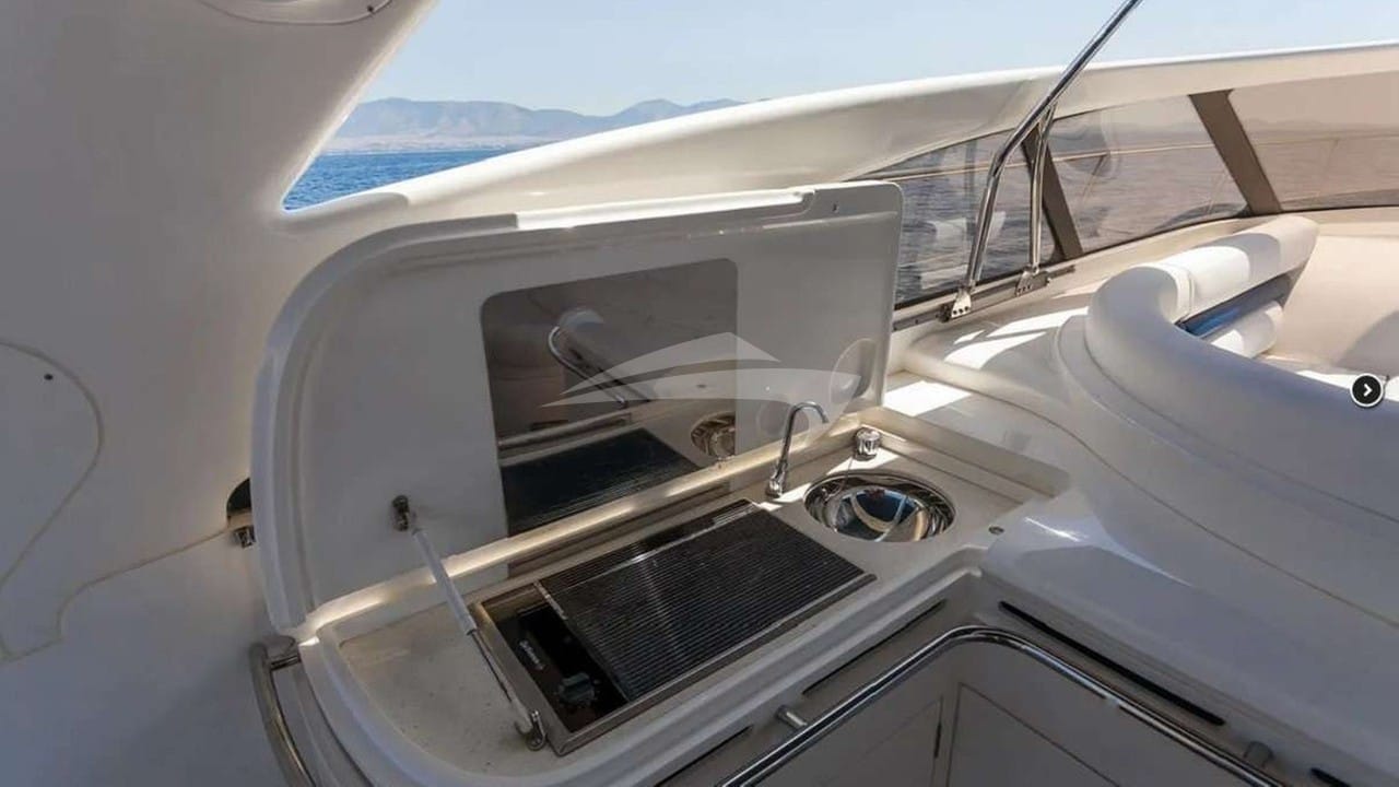 As comodidades a bordo para os hóspedes charter incluem ar condicionado, churrasqueira, chuveiro externo, sistema de áudio interno, TV via satélite, plataforma de natação, sala de TV e Wi-Fi.