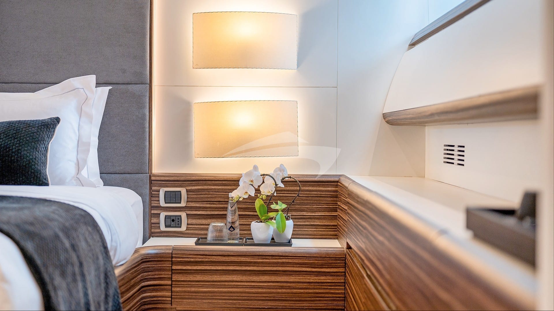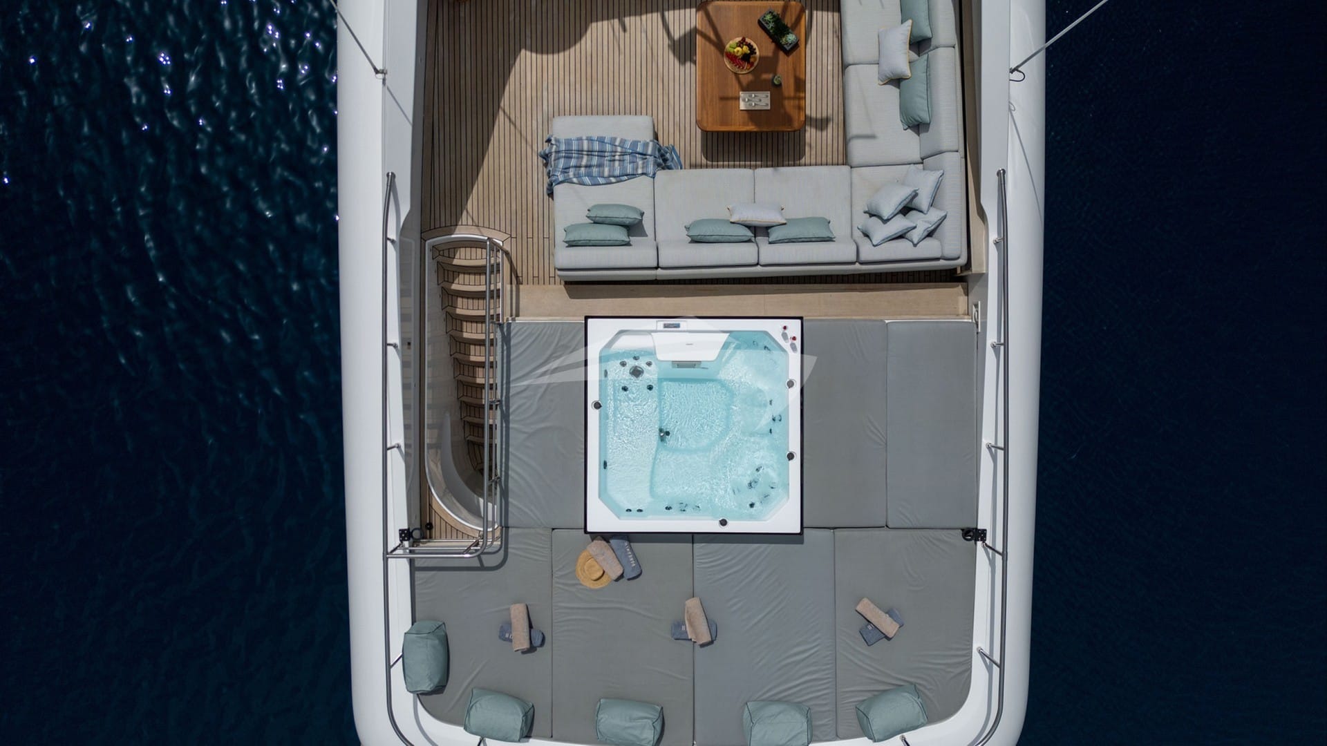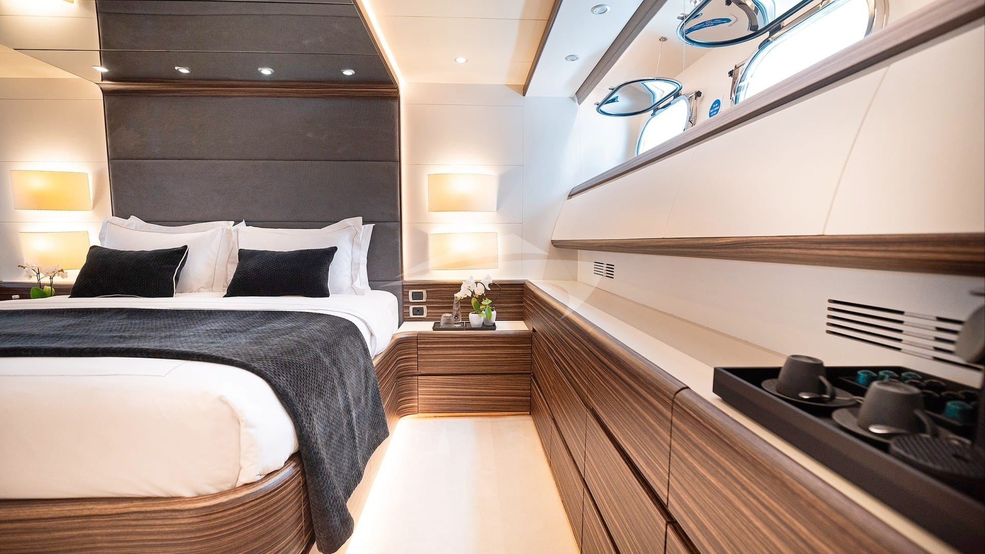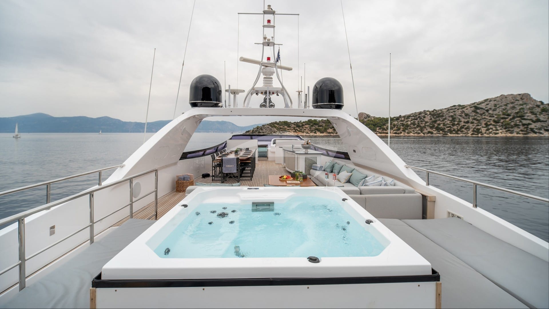 As comodidades a bordo para os hóspedes charter incluem ar condicionado, churrasqueira, sistema de áudio interno, jacuzzi no convés, plataforma de natação, TV em todas as cabines e salão de TV.
