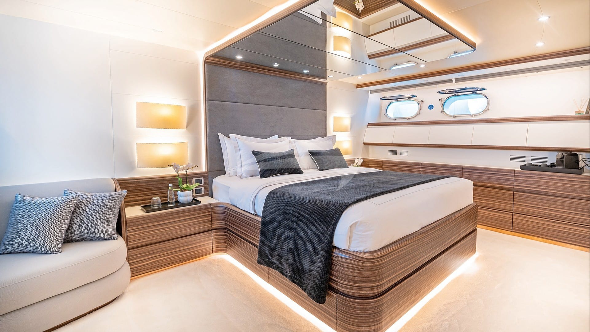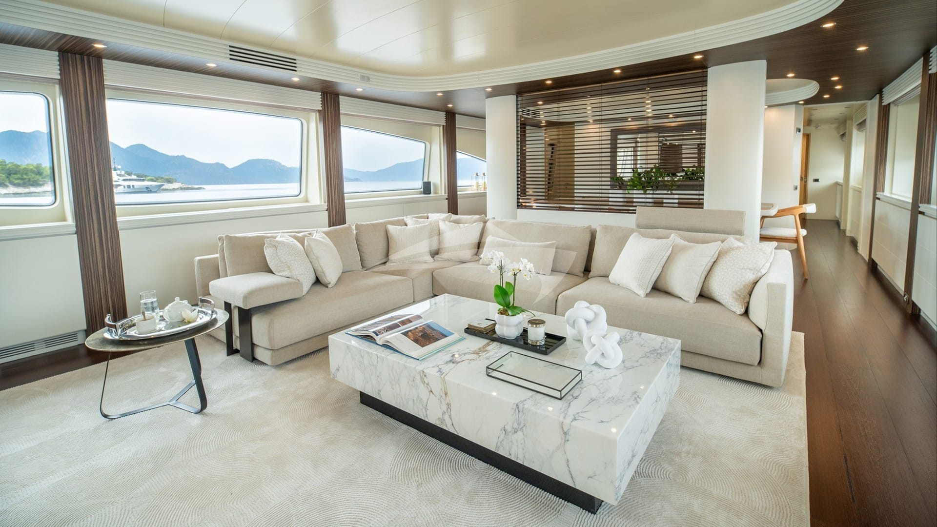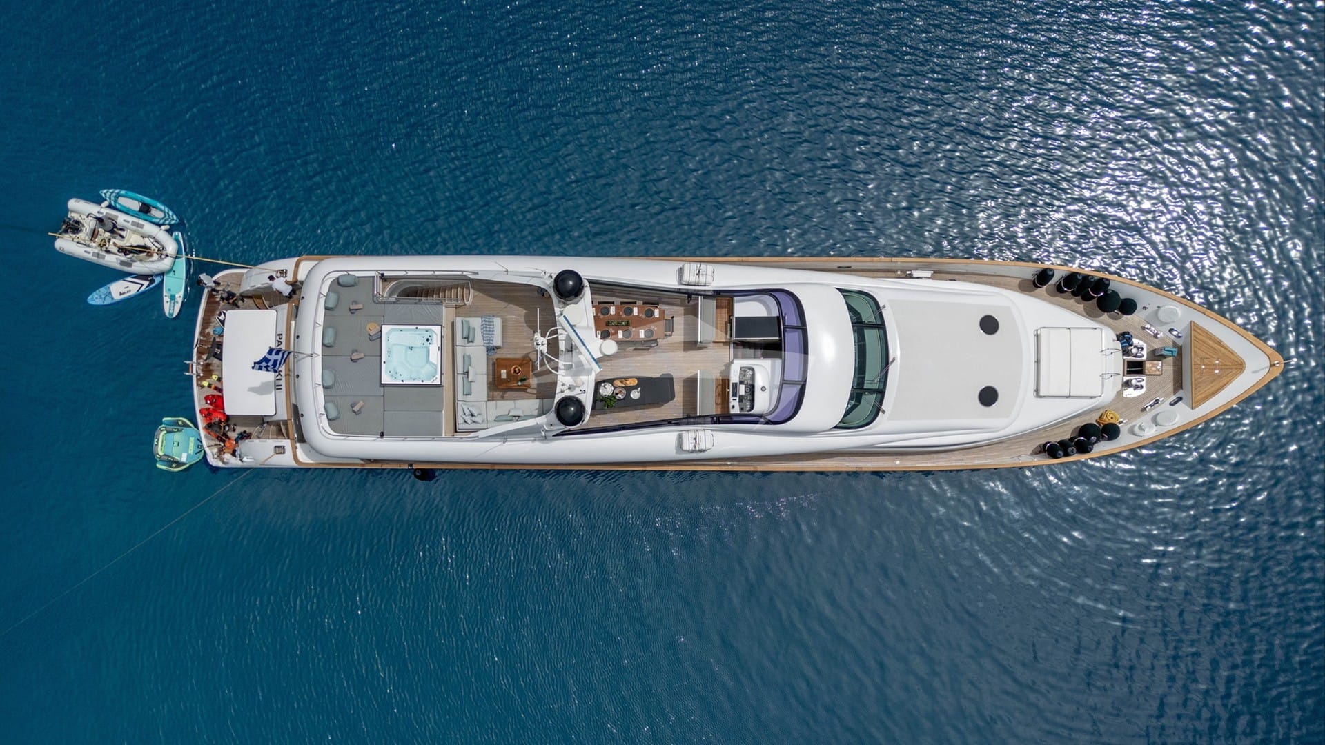 As comodidades a bordo para os hóspedes charter incluem ar condicionado, churrasqueira, sistema de áudio interno, jacuzzi no convés, plataforma de natação, TV em todas as cabines e salão de TV.