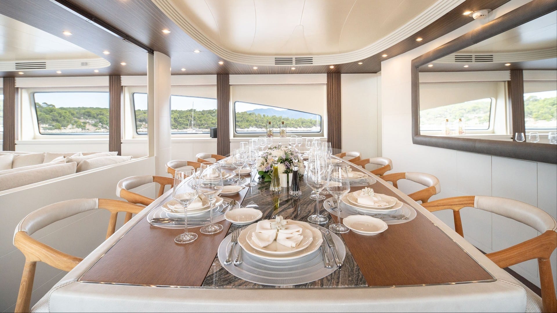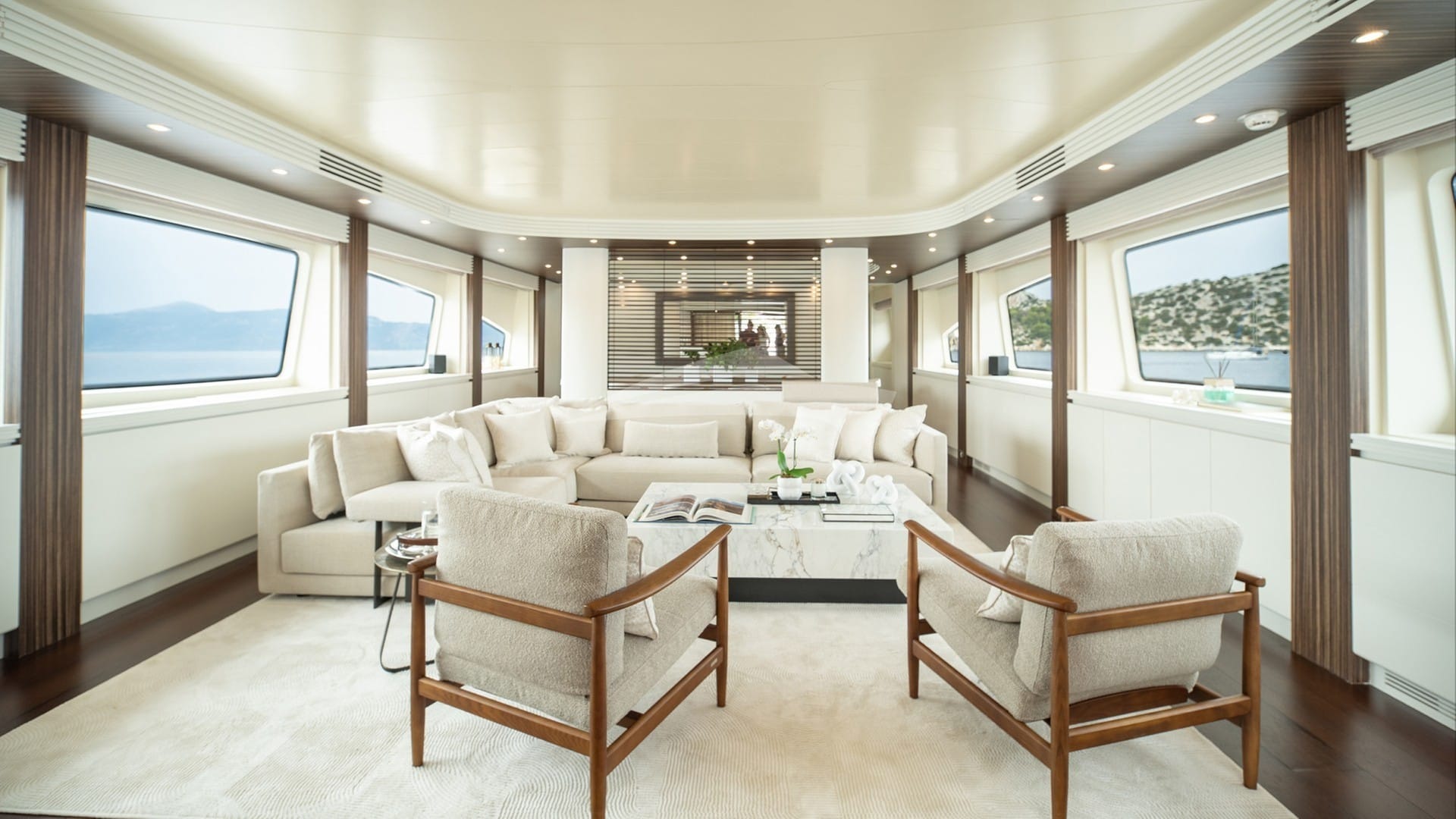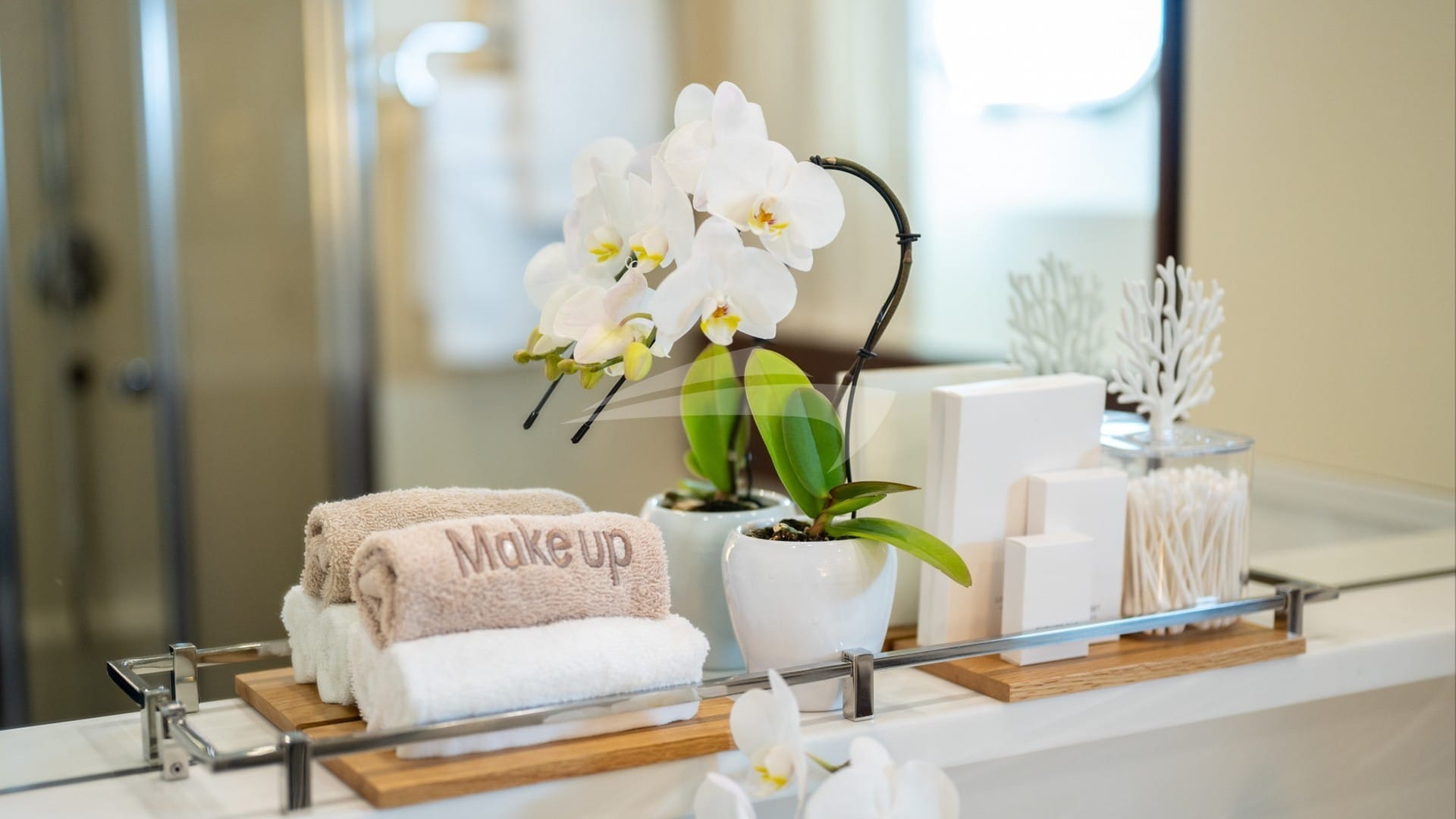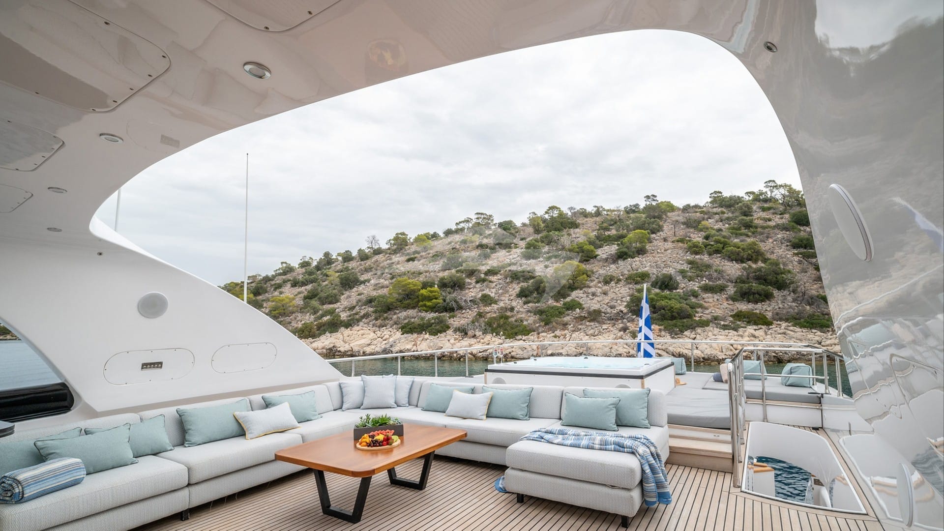 As comodidades a bordo para os hóspedes charter incluem ar condicionado, churrasqueira, sistema de áudio interno, jacuzzi no convés, plataforma de natação, TV em todas as cabines e salão de TV.