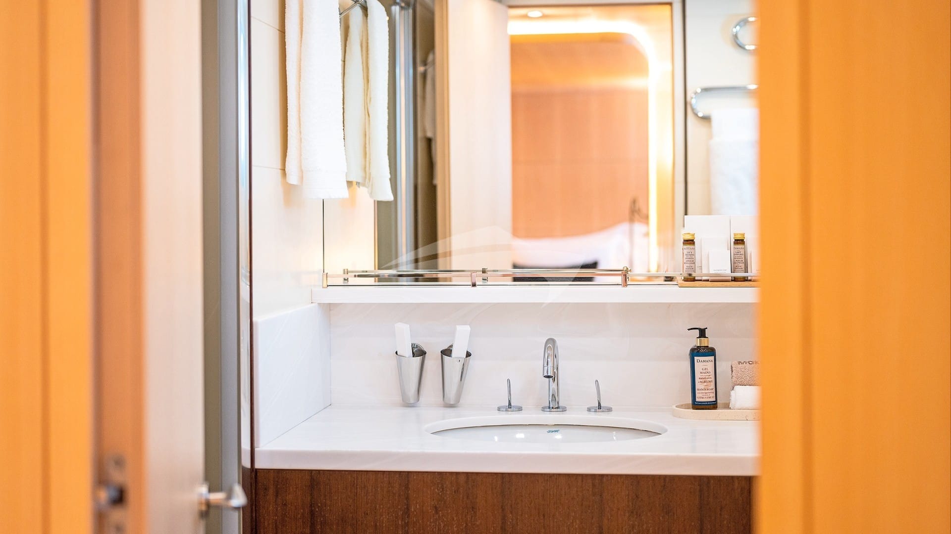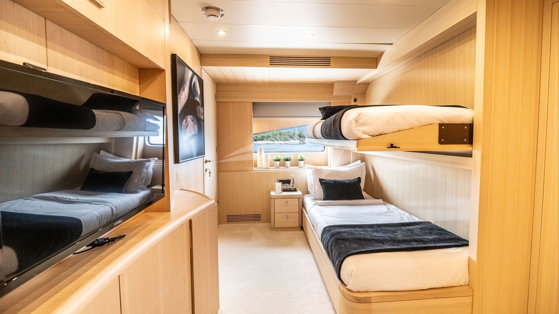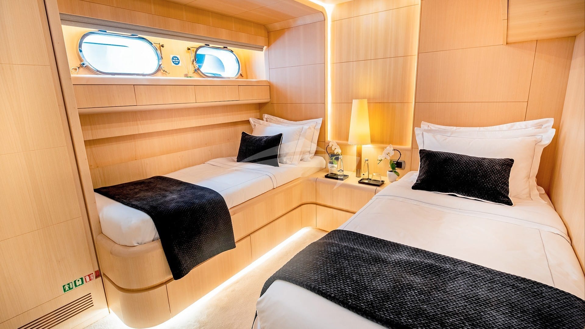 As cabines de hóspedes incluem uma suíte principal com cama king size e banheiro privativo, 2 suítes VIP com cama queen size e banheiro privativo e 3 cabines com cama de solteiro e banheiro privativo.