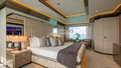 As comodidades a bordo para os hóspedes charter incluem ar condicionado, clube de praia, jacuzzi no convés, karaokê, estabilizadores e Wi-Fi.