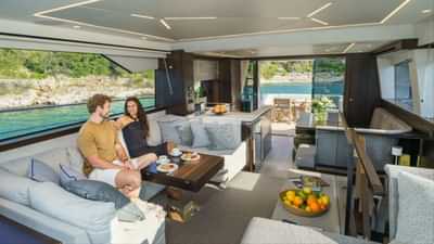 As comodidades a bordo incluem ar condicionado, clube de praia, equipamento de pesca leve e Wi-Fi.