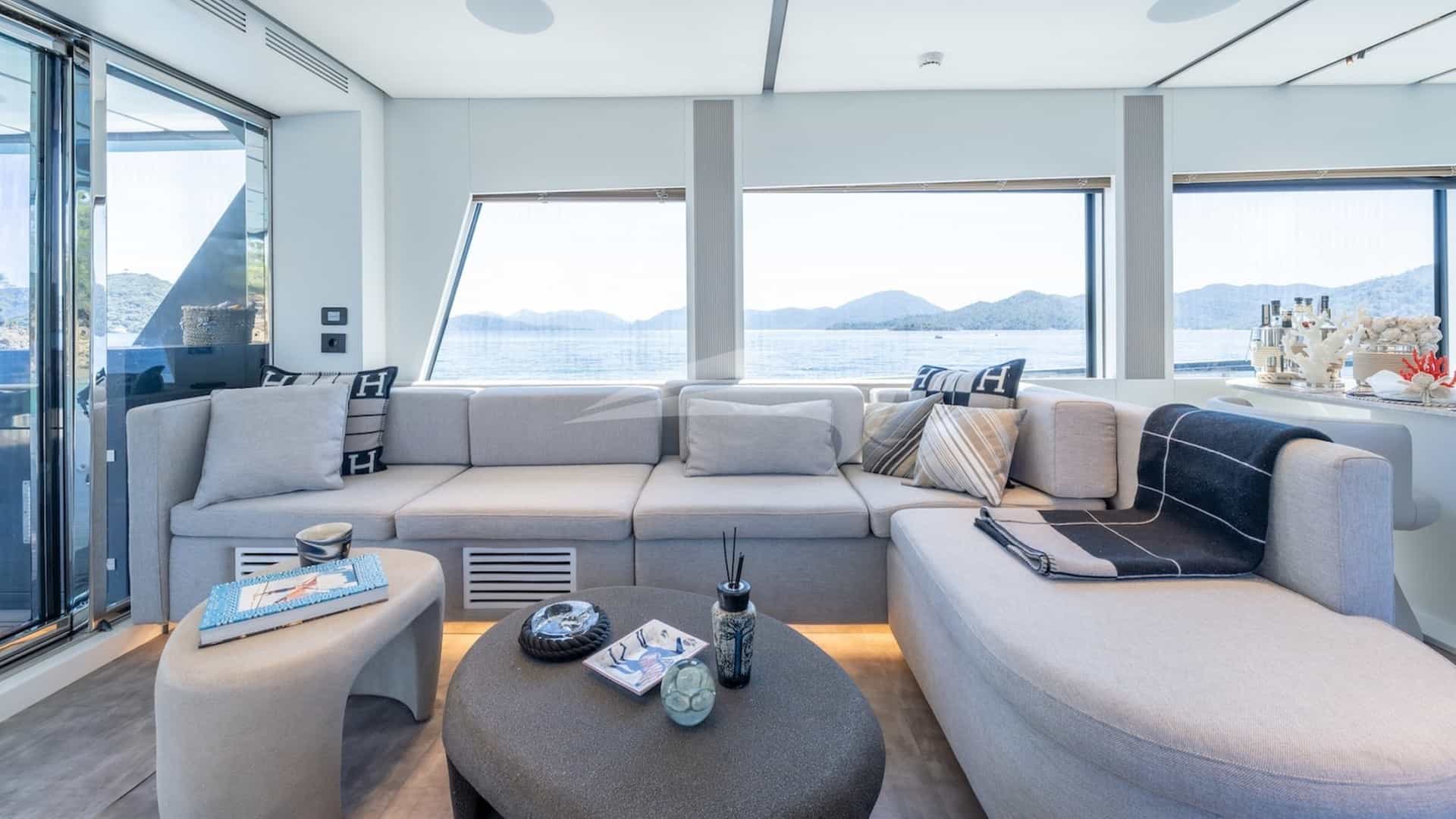 As comodidades a bordo para os hóspedes charter incluem ar condicionado, churrasqueira, assentos na proa, mesa de estar na proa, plataforma hidráulica de natação, sistema de áudio interno, servidor de filmes de mídia, servidor de música MP3, sistema de áudio externo, bar externo, TV via satélite, estabilizadores, estabilizadores ancorados, streaming de mídia on-line, protetores solares, solário, plataforma de natação, TV, todas as cabines, cabine principal de TV, salão de TV, máquina de água e Wi-Fi.