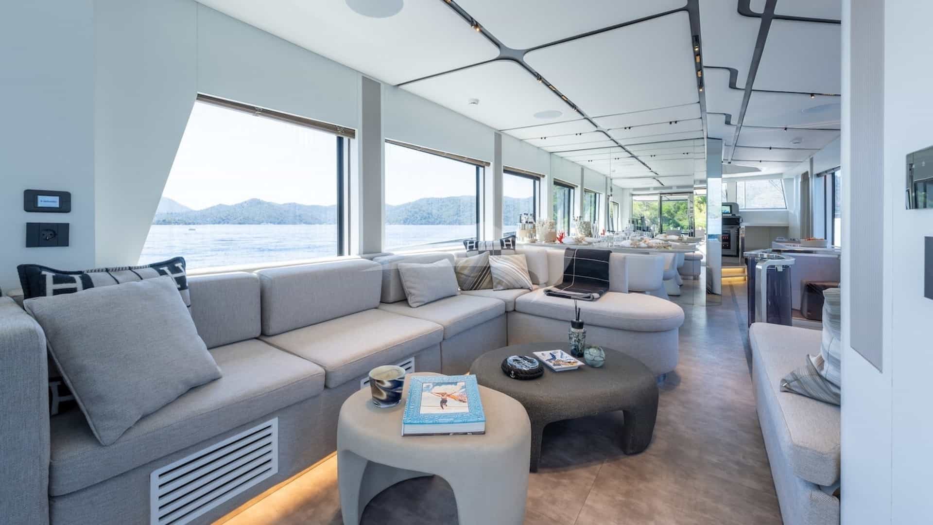 FERRO 77 pode acomodar 8 hóspedes dormindo a bordo em 4 cabines, com capacidade de cruzeiro com até 12 convidados e entreter grupos de até 8 hóspedes ancorados ou atracados em uma marina.
