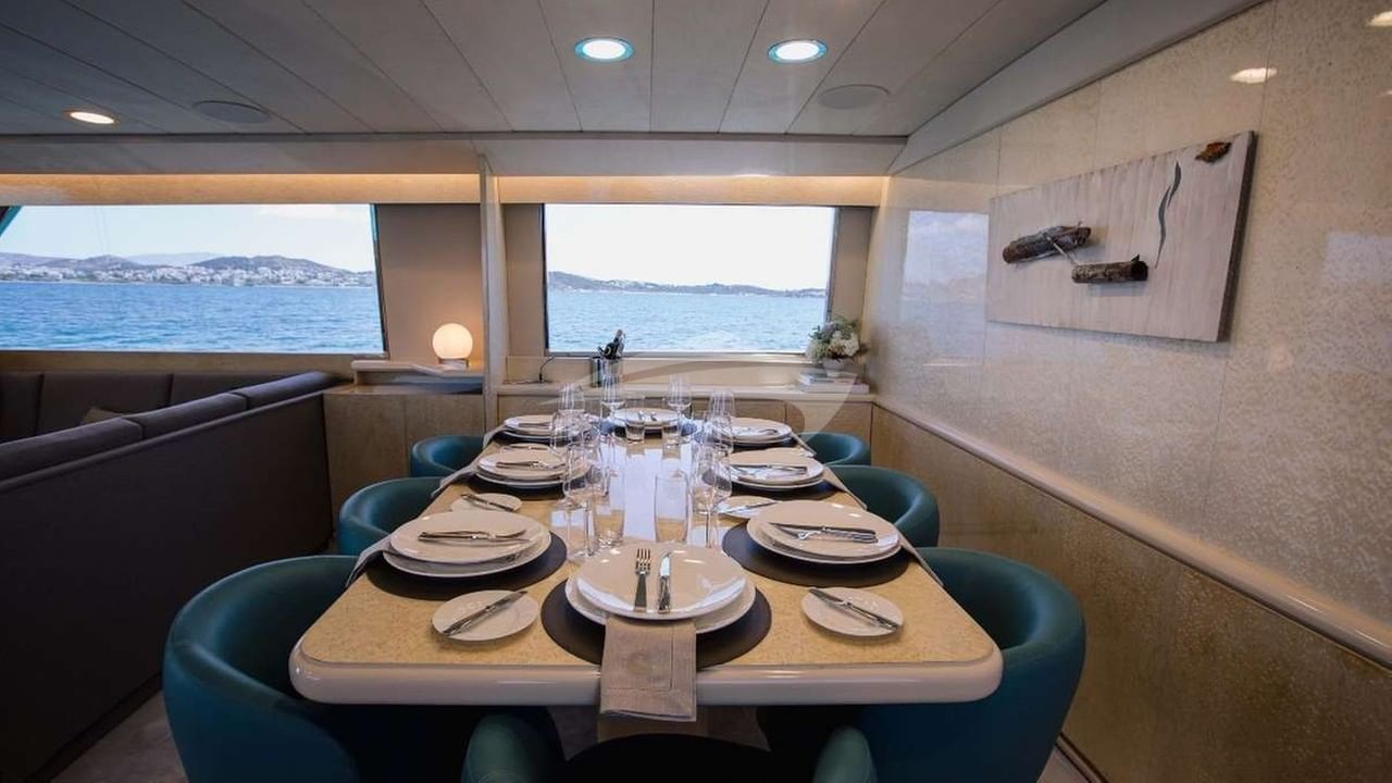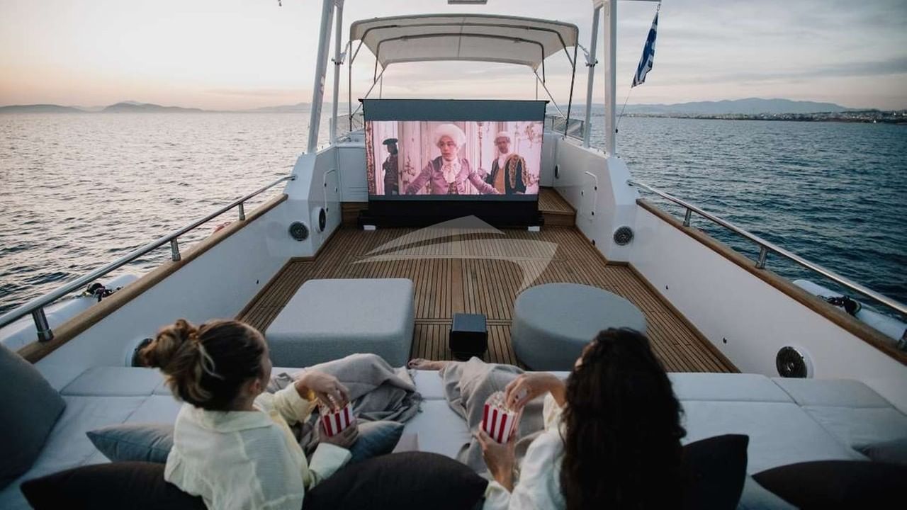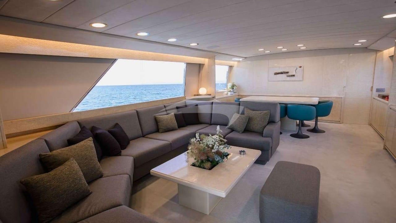 As comodidades a bordo para os hóspedes charter incluem ar condicionado, sistema de áudio interno, plataforma de natação, sala de TV e Wi-Fi.