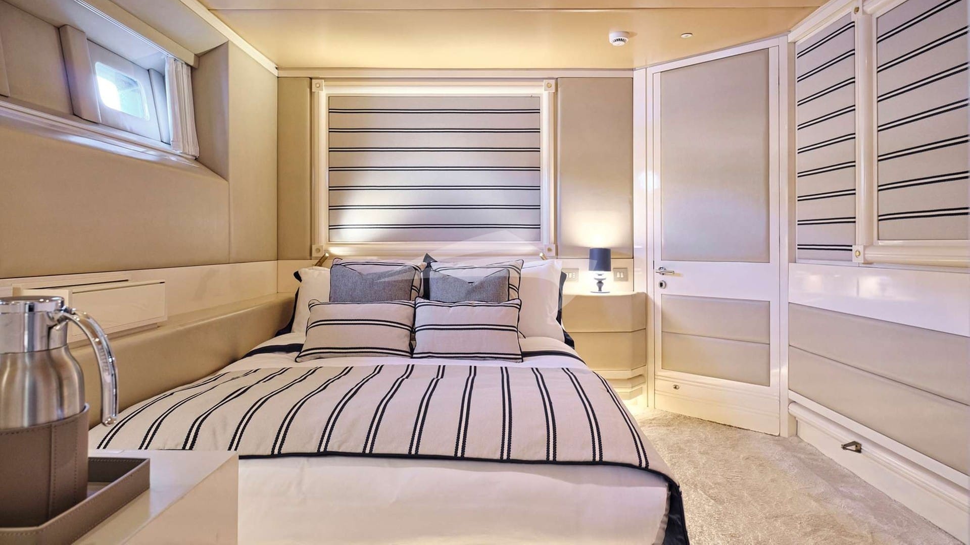 As comodidades a bordo para os hóspedes charter incluem ar condicionado, sistema de áudio interno, TV via satélite, estabilizadores ancorados, plataforma de natação, sala de TV e Wi-Fi.