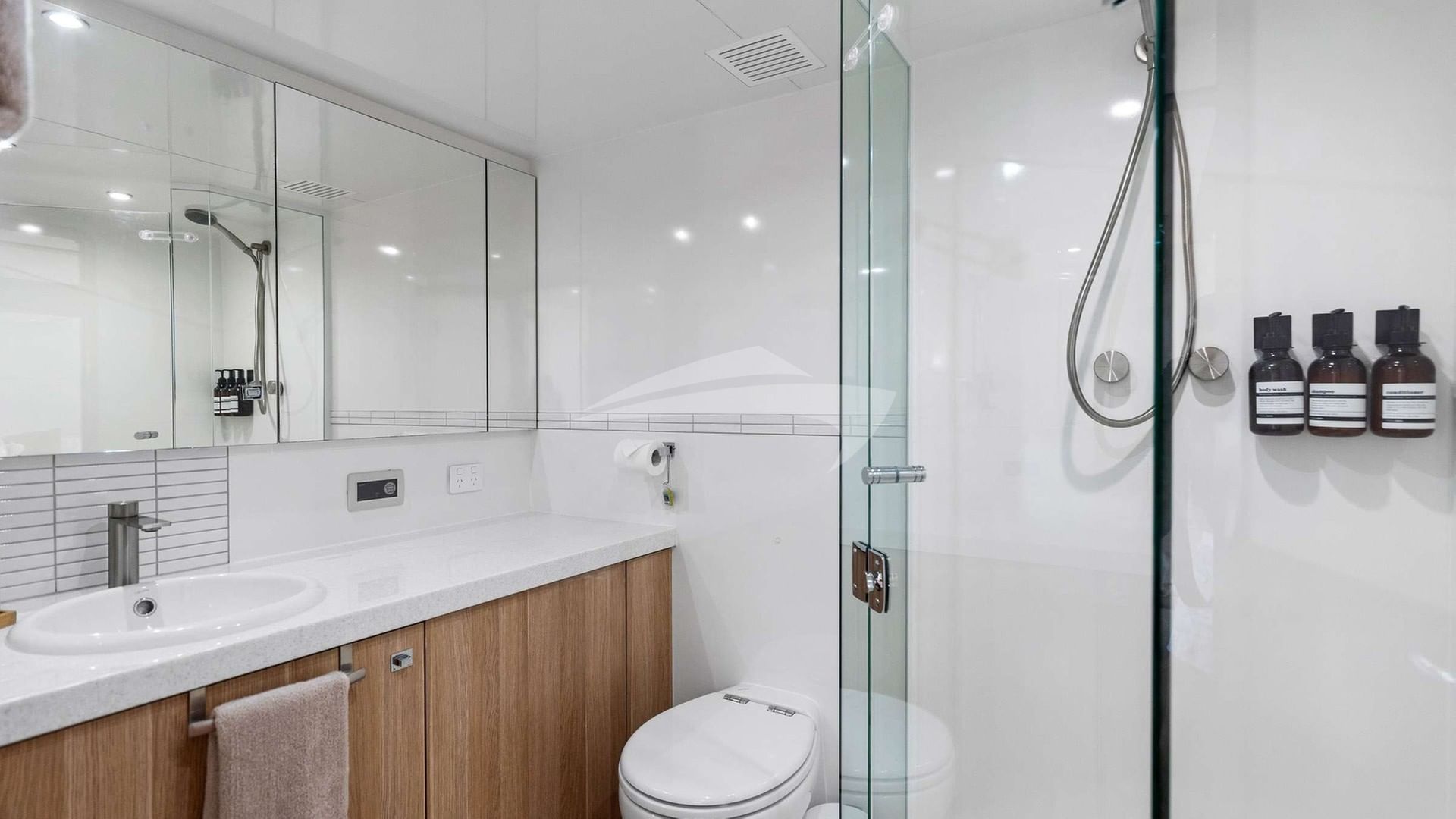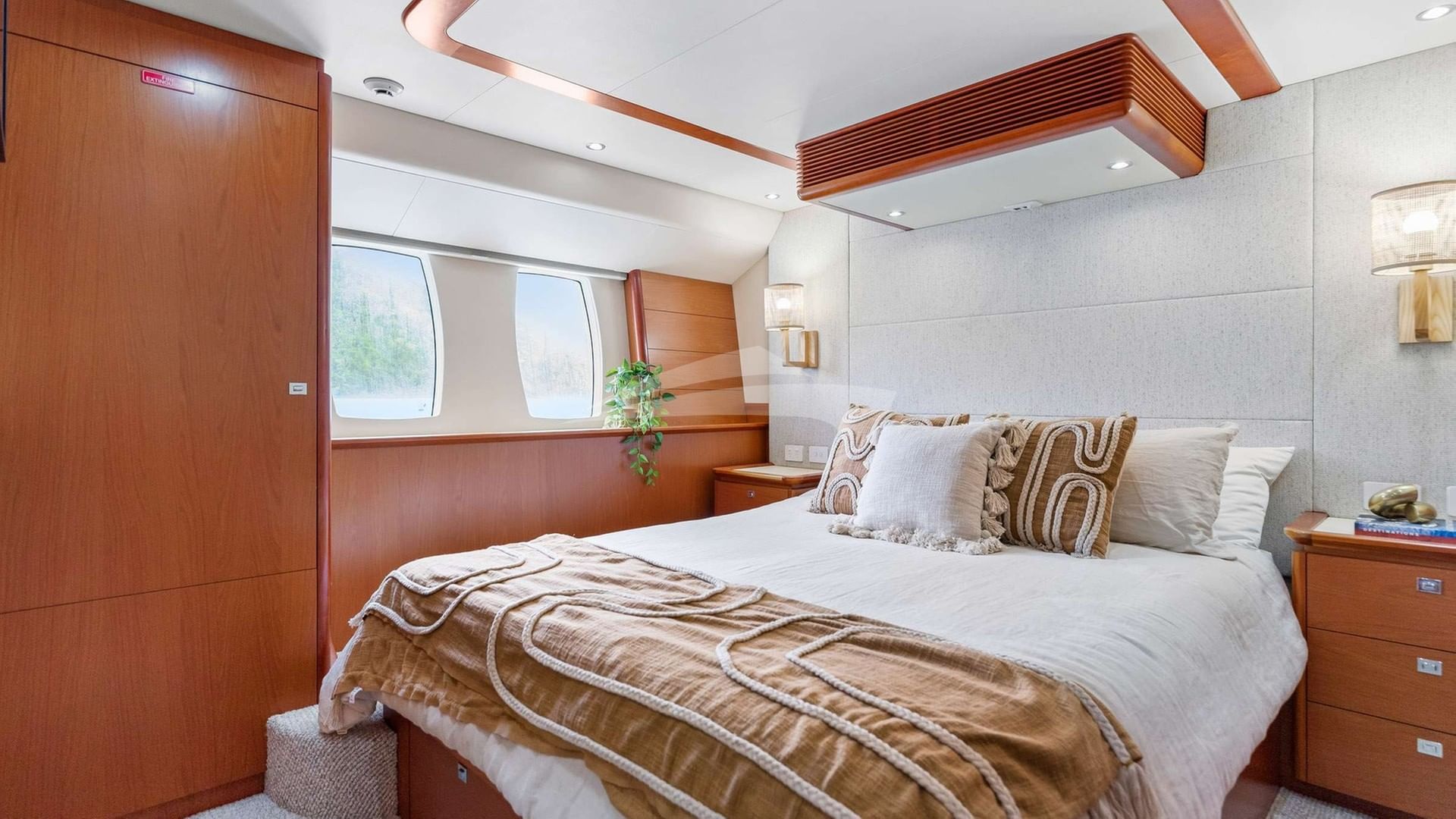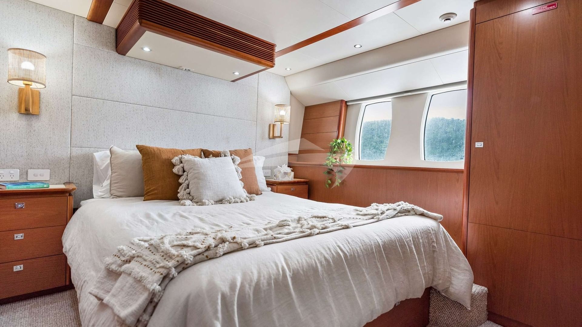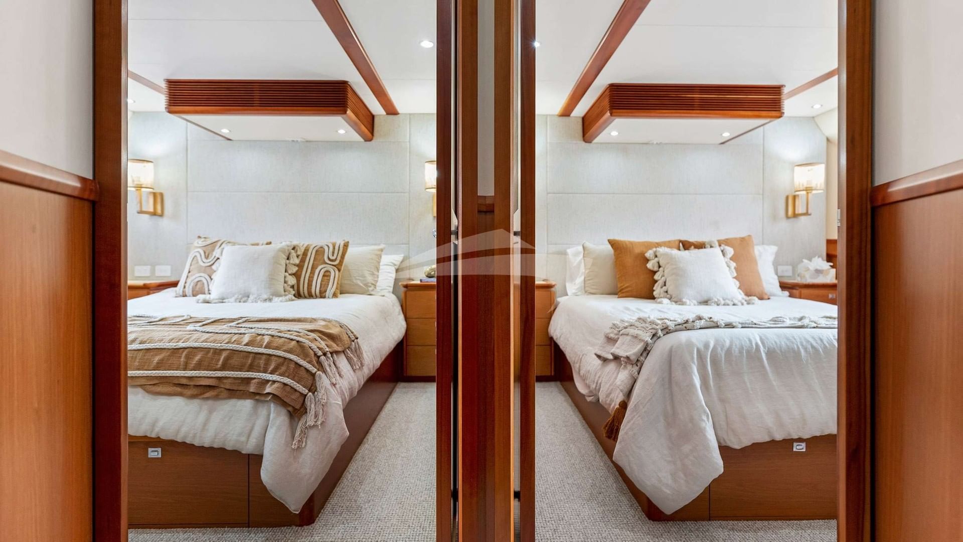 As cabines de hóspedes incluem uma suíte principal com uma cama king size e banheiro privativo e 3 cabines com cama queen size e banheiro privativo.