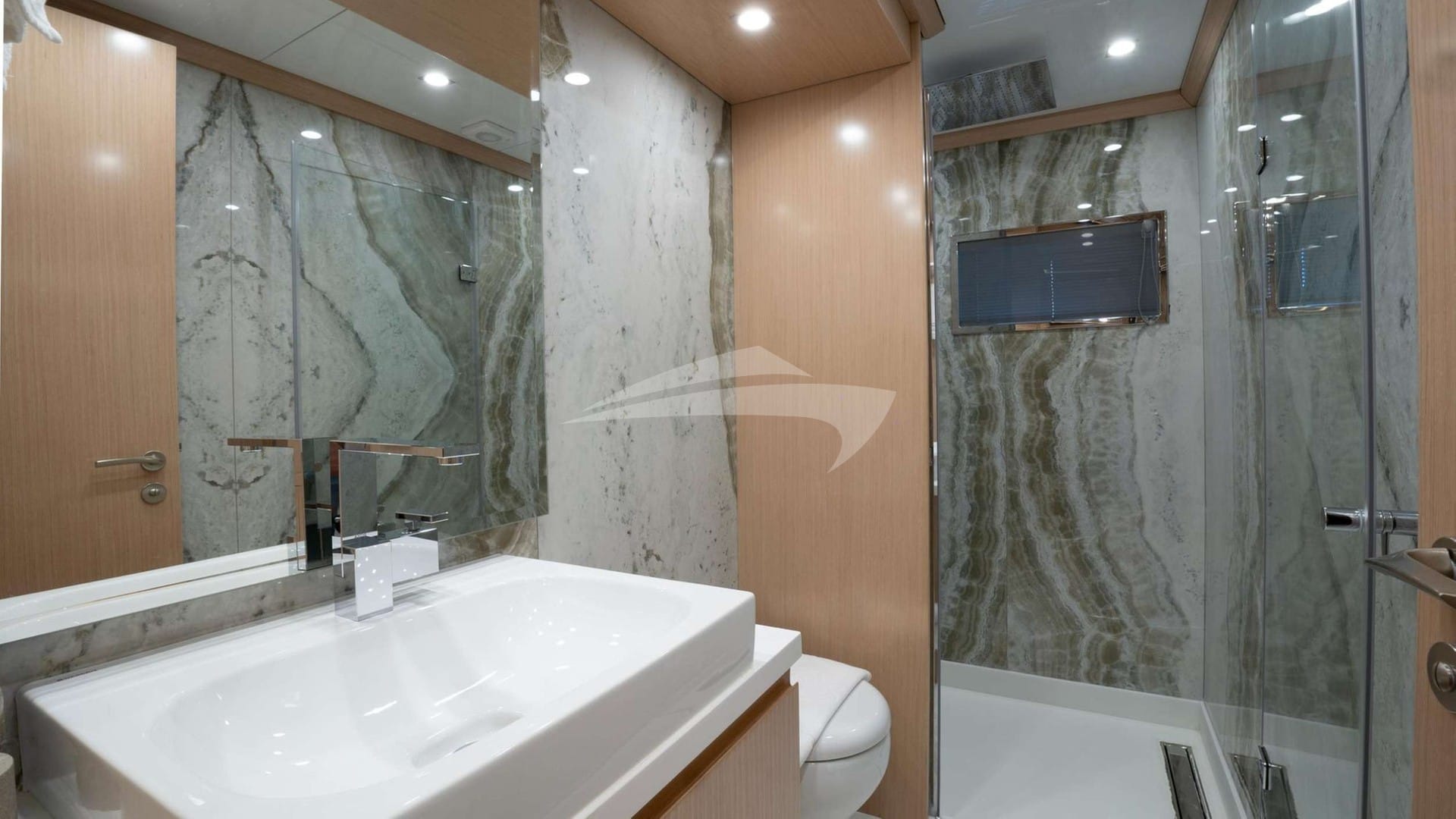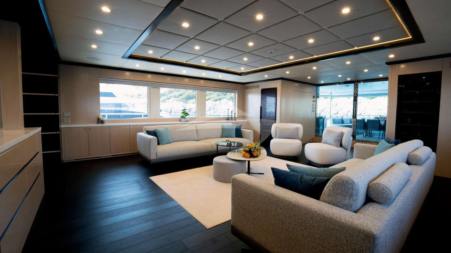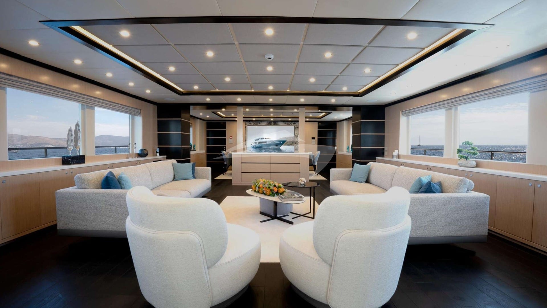 As comodidades a bordo para os hóspedes charter incluem ar-condicionado, chuveiro externo, sistema de áudio interno, estabilizadores Anchor e salão de TV.