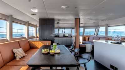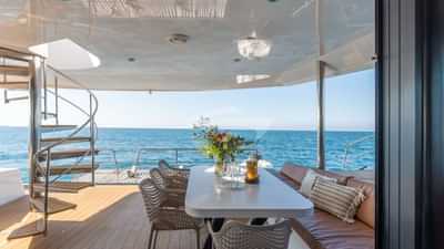 As comodidades a bordo para os hóspedes charter incluem ar-condicionado, churrasqueira, academia, sistema de áudio interno, plataforma de natação e salão de TV.