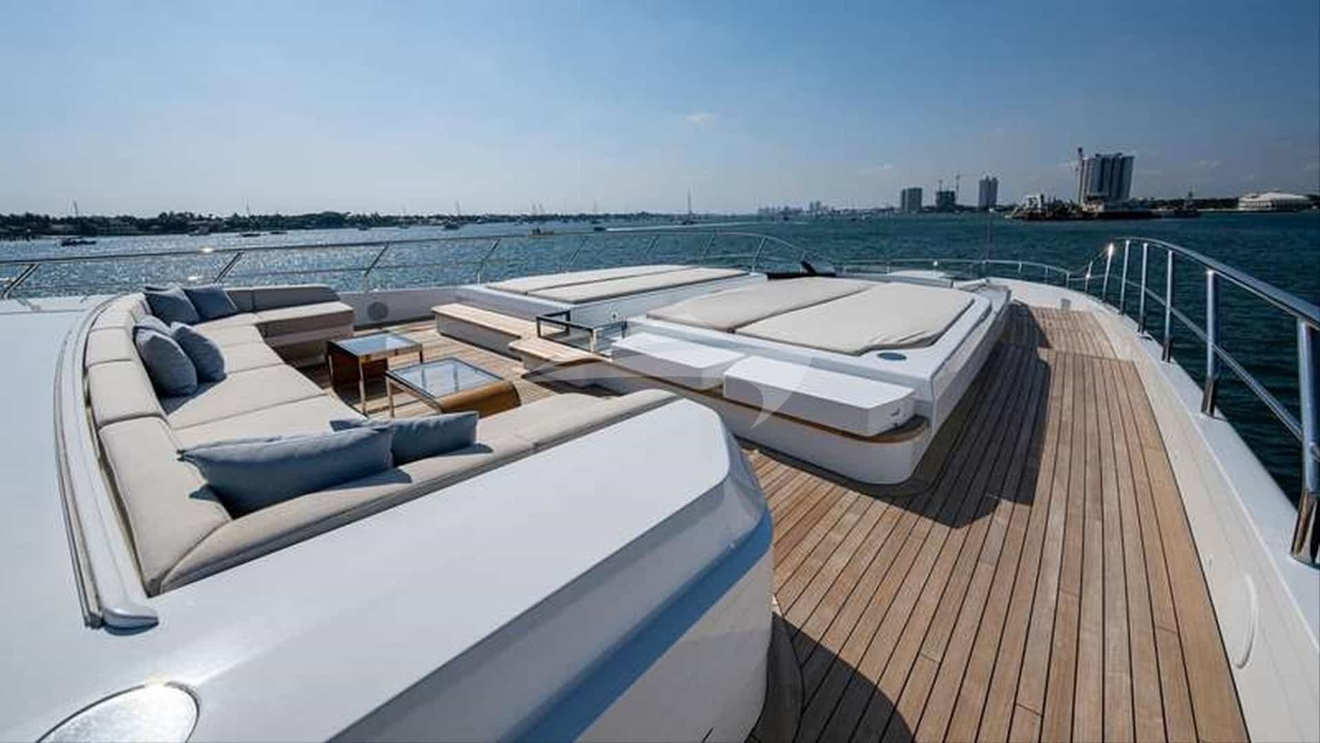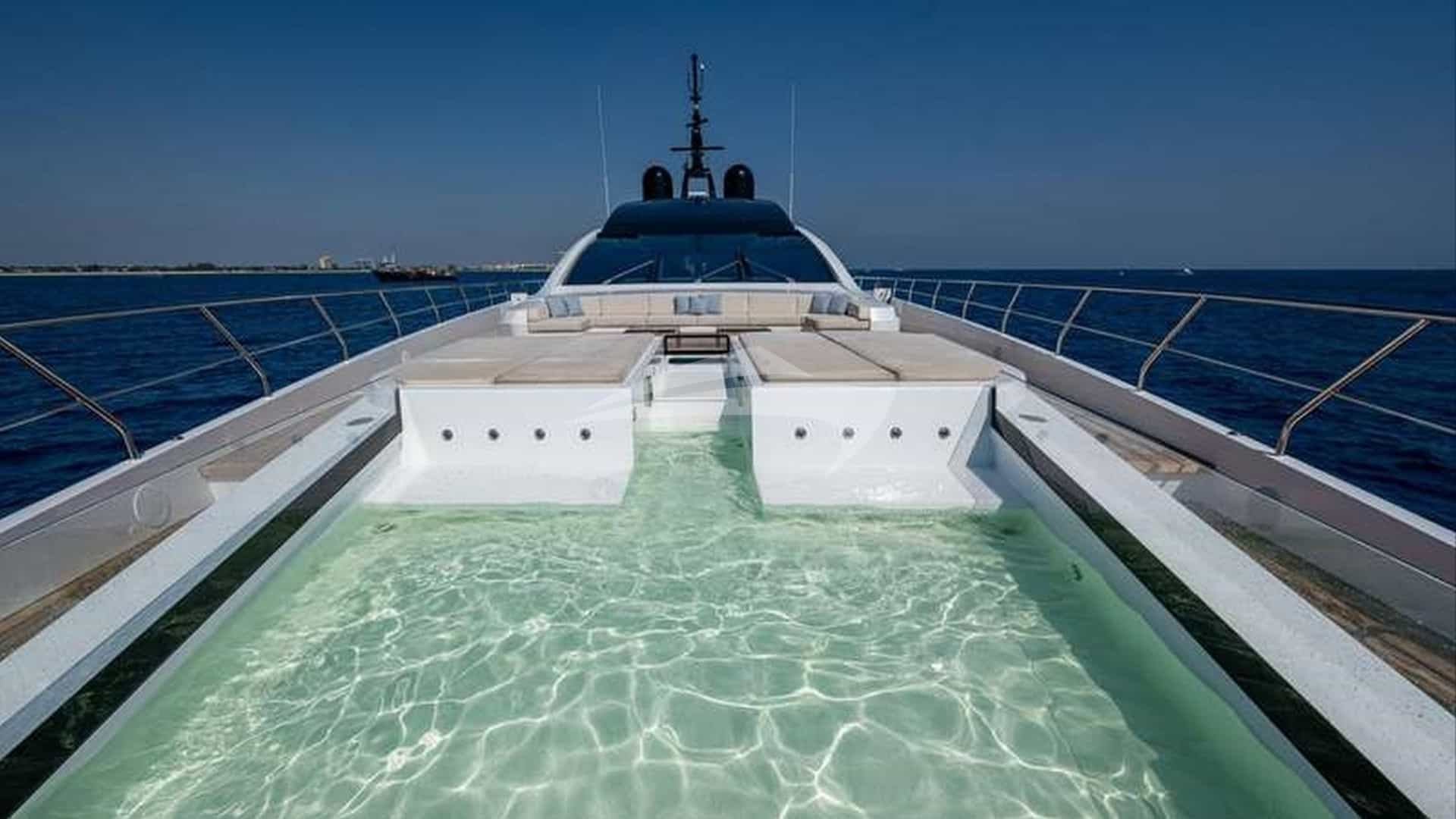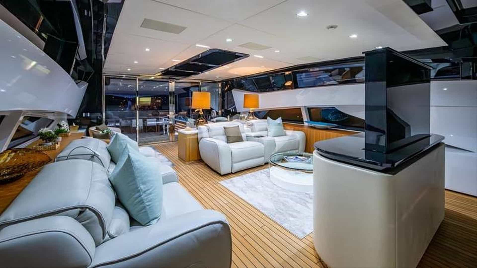As comodidades a bordo para os hóspedes charter incluem ar condicionado, clube de praia, equipamento de pesca leve, jacuzzi no convés, TV via satélite, estabilizadores e Wi-Fi.