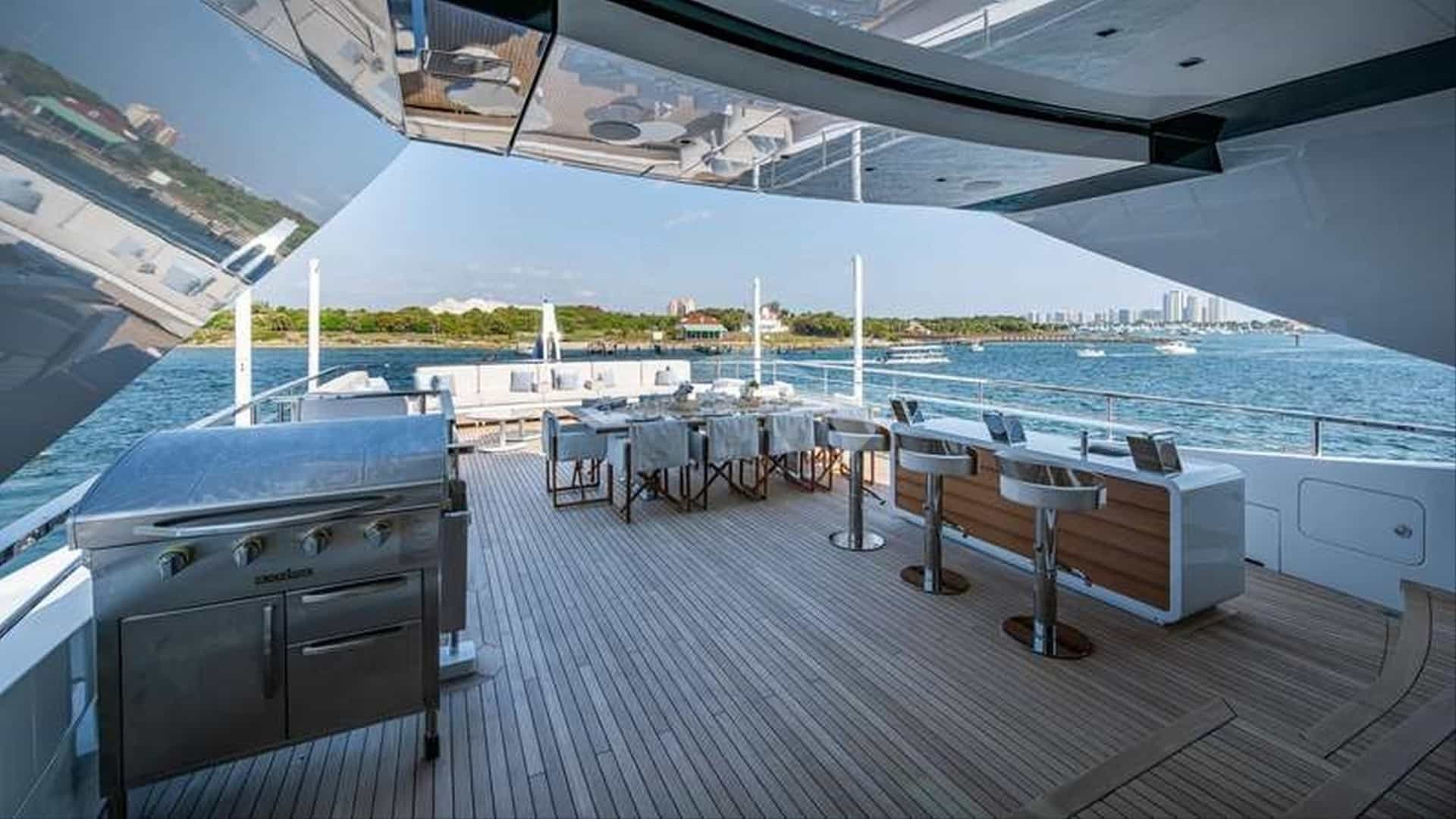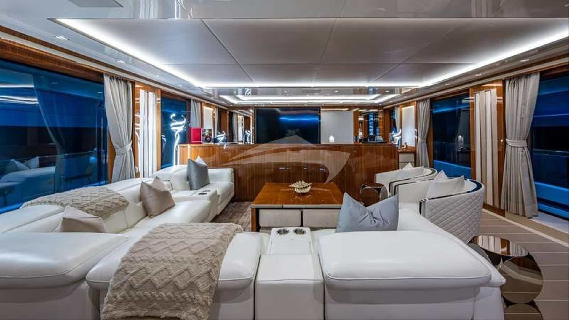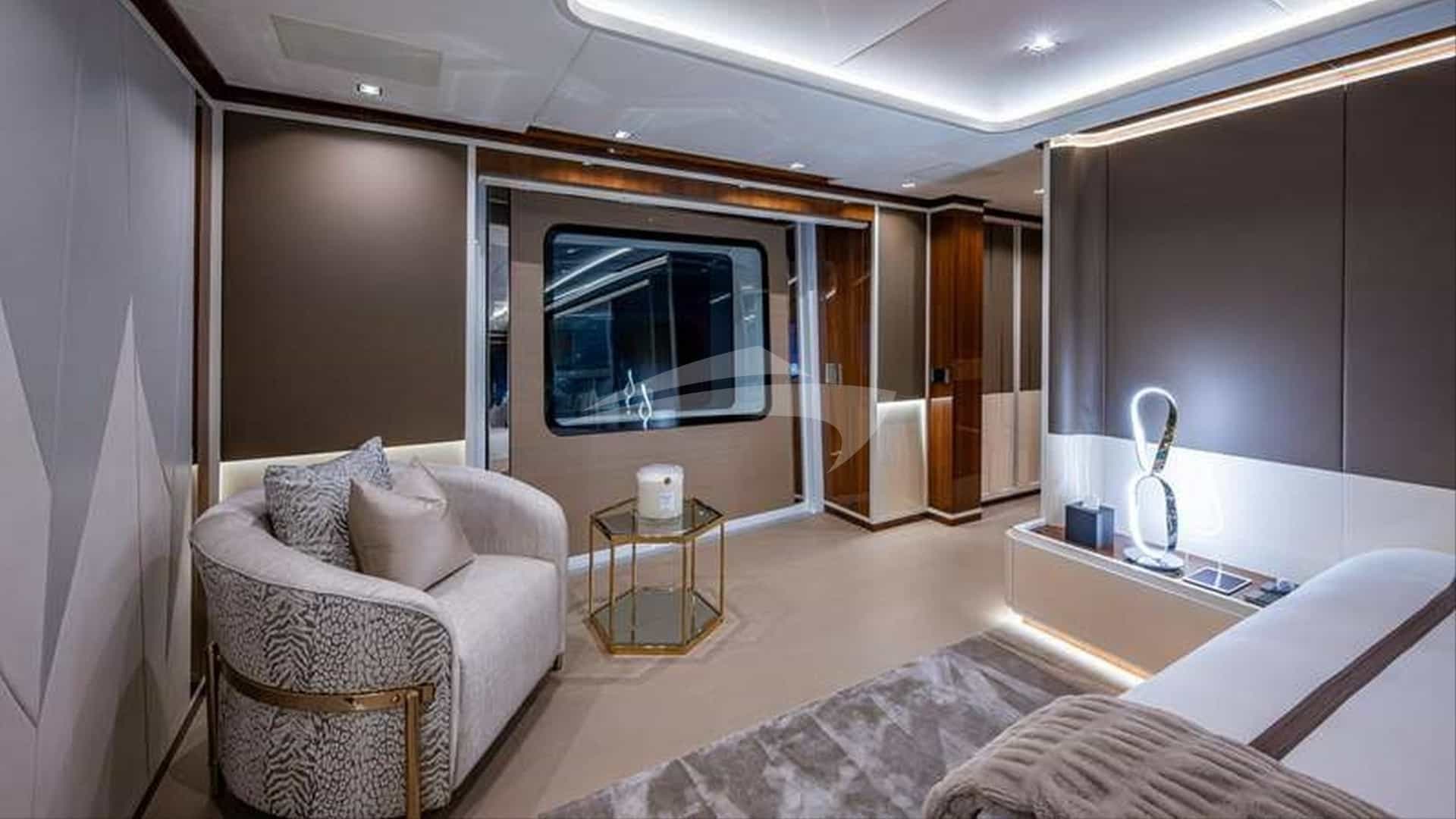 As comodidades a bordo para os hóspedes charter incluem ar condicionado, clube de praia, equipamento de pesca leve, jacuzzi no convés, TV via satélite, estabilizadores e Wi-Fi.