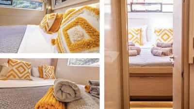As cabines de hóspedes incluem uma suíte principal com uma cama queen size e banheiro privativo, 3 cabines com cama queen size e banheiro privativo e uma cabine com cama de casal.