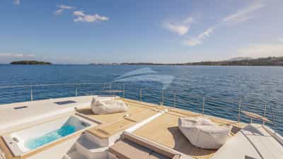 As comodidades a bordo para os hóspedes charter incluem ar condicionado, sistema de áudio interno, jacuzzi no convés, sala de TV e Wi-Fi.