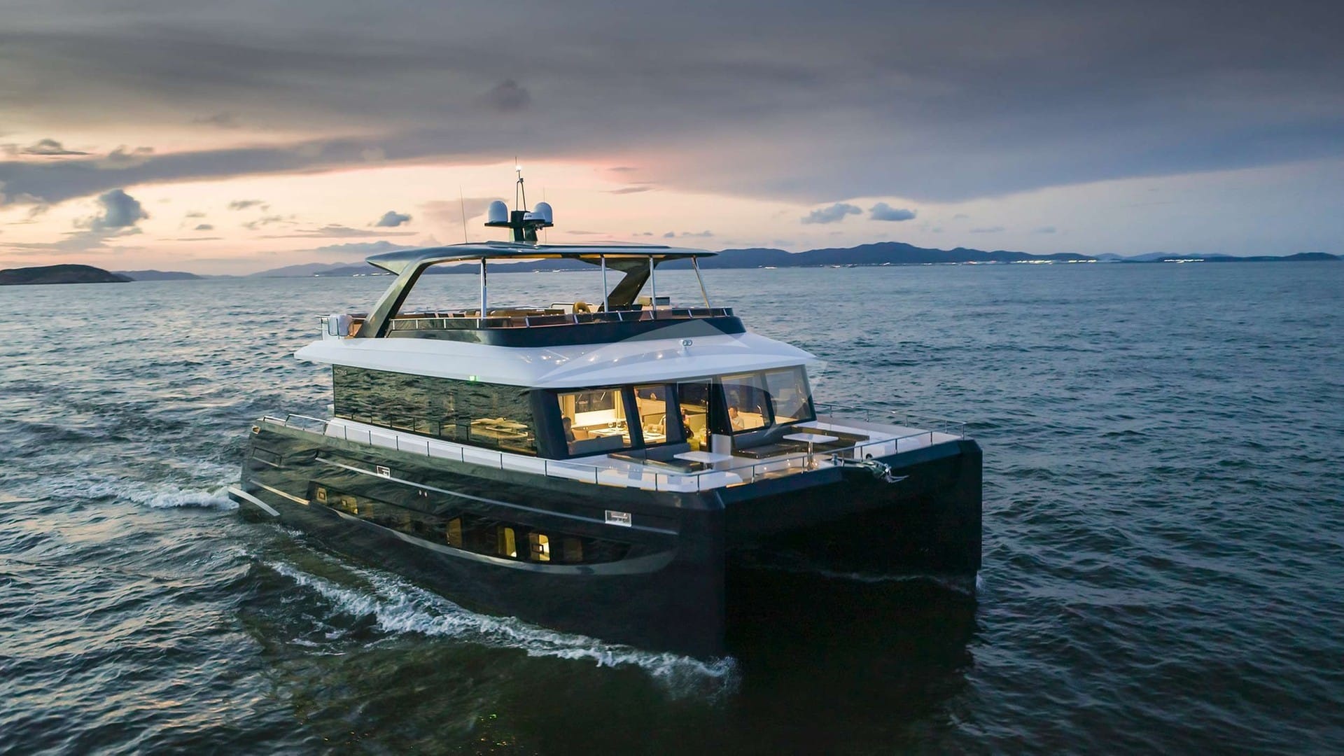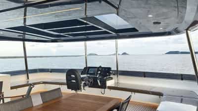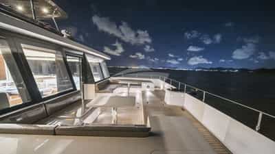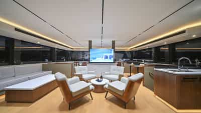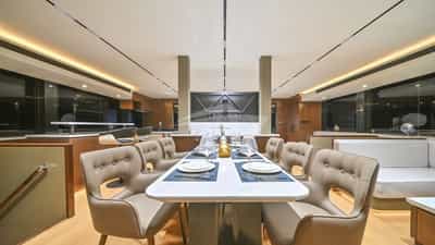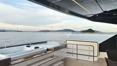 As comodidades a bordo para os hóspedes charter incluem ar condicionado, churrasqueira, sistema de áudio interno, jacuzzi no convés, sala de TV e Wi-Fi.