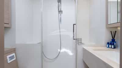 As cabines de hóspedes incluem uma suíte principal com cama de casal e banheiro privativo, 3 cabines com cama de casal e banheiro privativo e uma cabine com cama de solteiro e banheiro privativo.