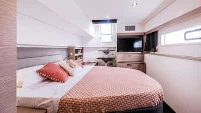 As cabines de hóspedes incluem uma suíte principal com cama de casal e banheiro privativo e 4 cabines com cama de casal e banheiro privativo.