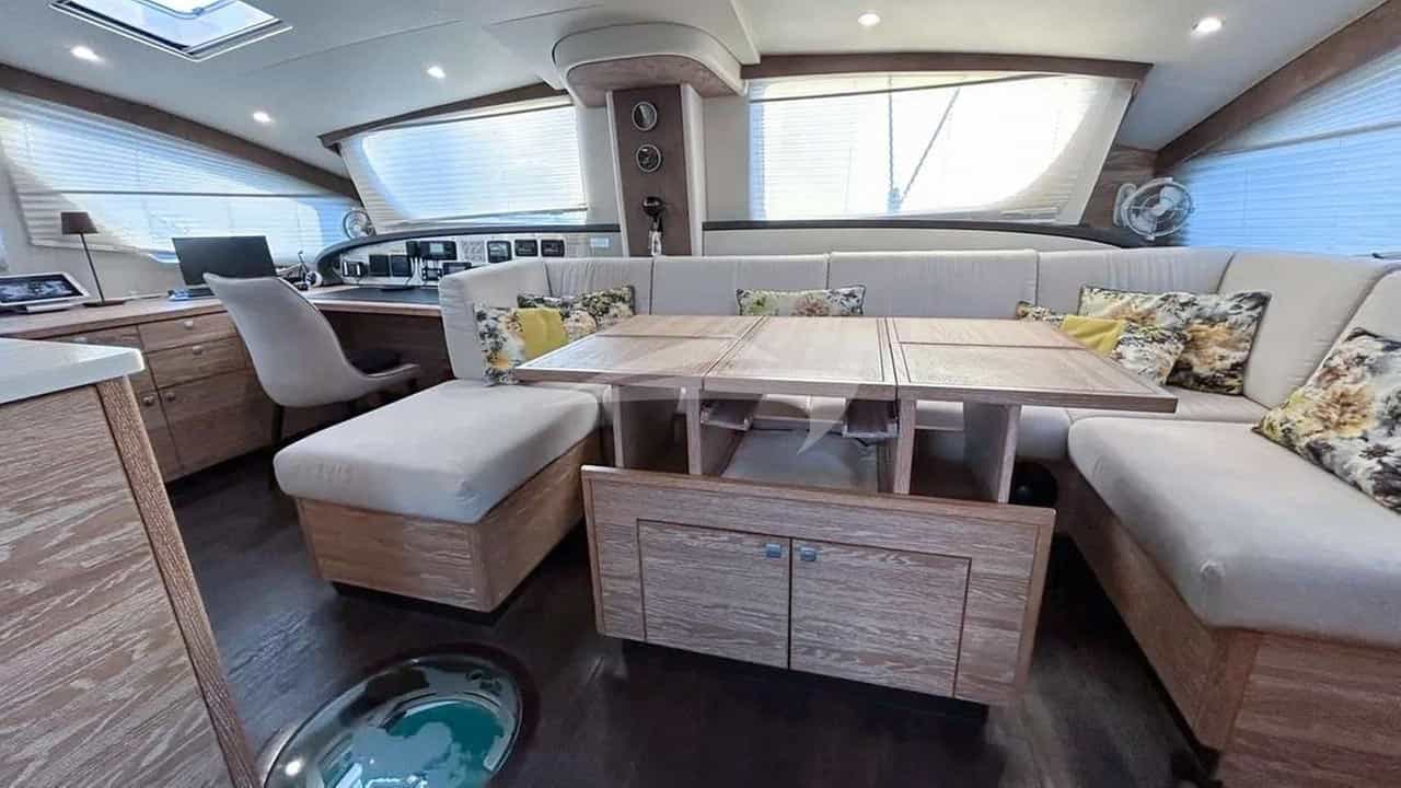 As comodidades a bordo para os hóspedes charter incluem ar condicionado, churrasqueira, chuveiro ao ar livre, equipamento de pesca esportiva, equipamento de pesca leve, sistema de áudio interno, dock para iPod, sala de TV e Wi-Fi.